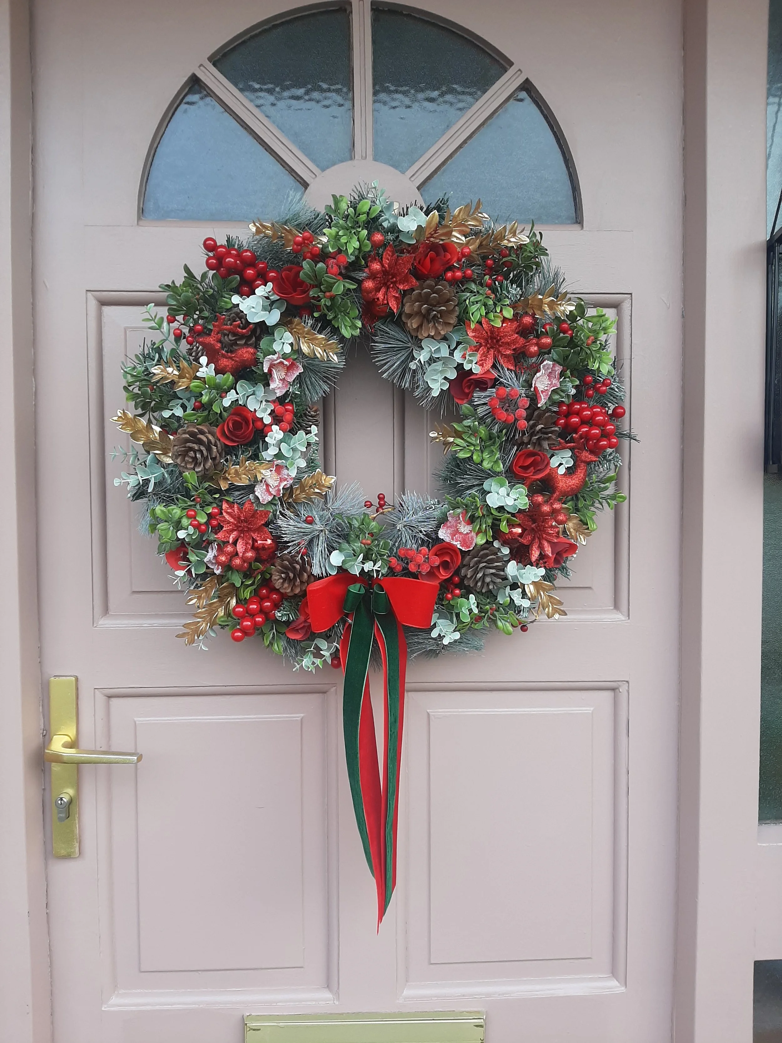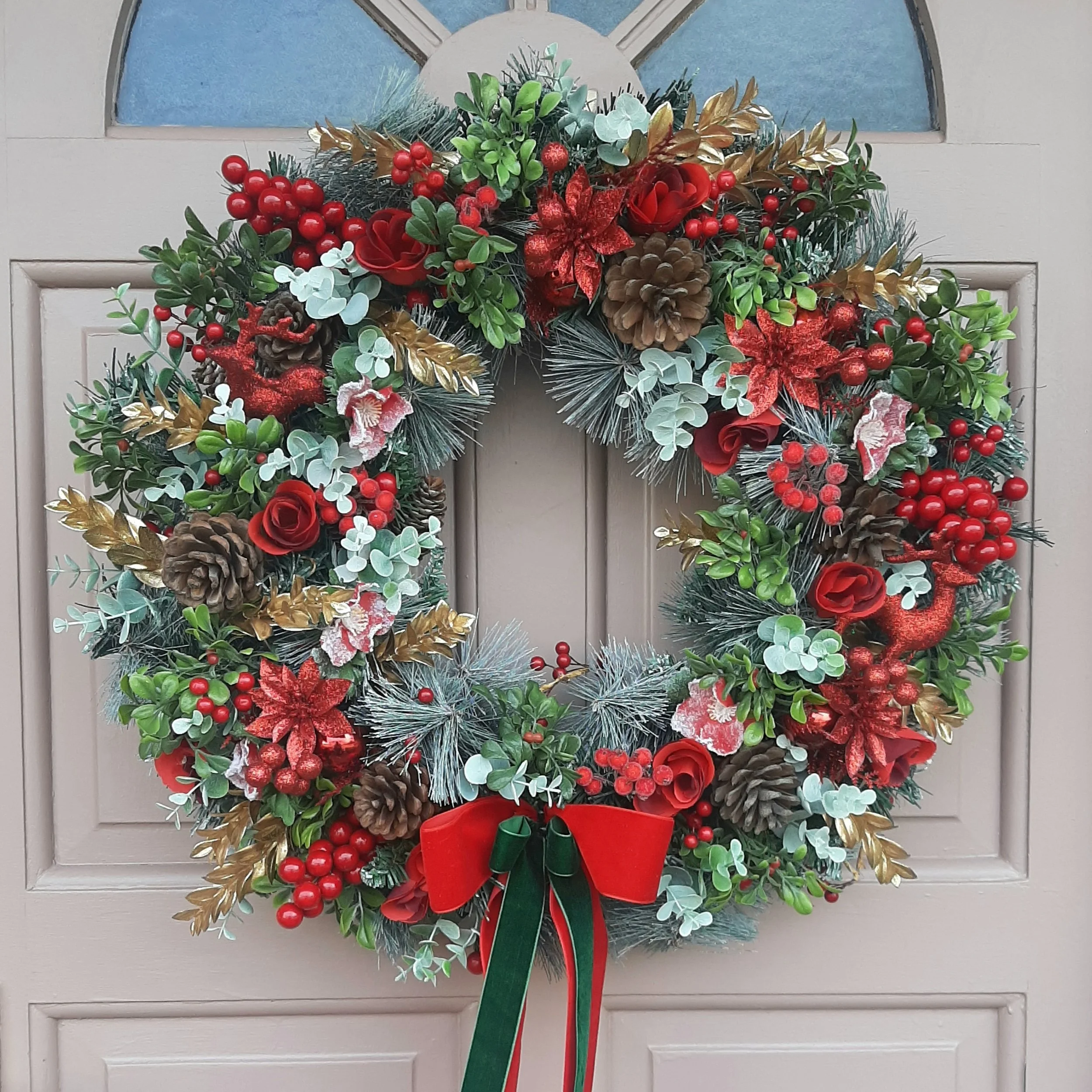 Created on an extra full flocked base brought to life with red, green and gold tones using poinsettias, baubles, berries and two red reindeer nestled in an abundance of foliage. Completed with a double bow in red and green velvet.
