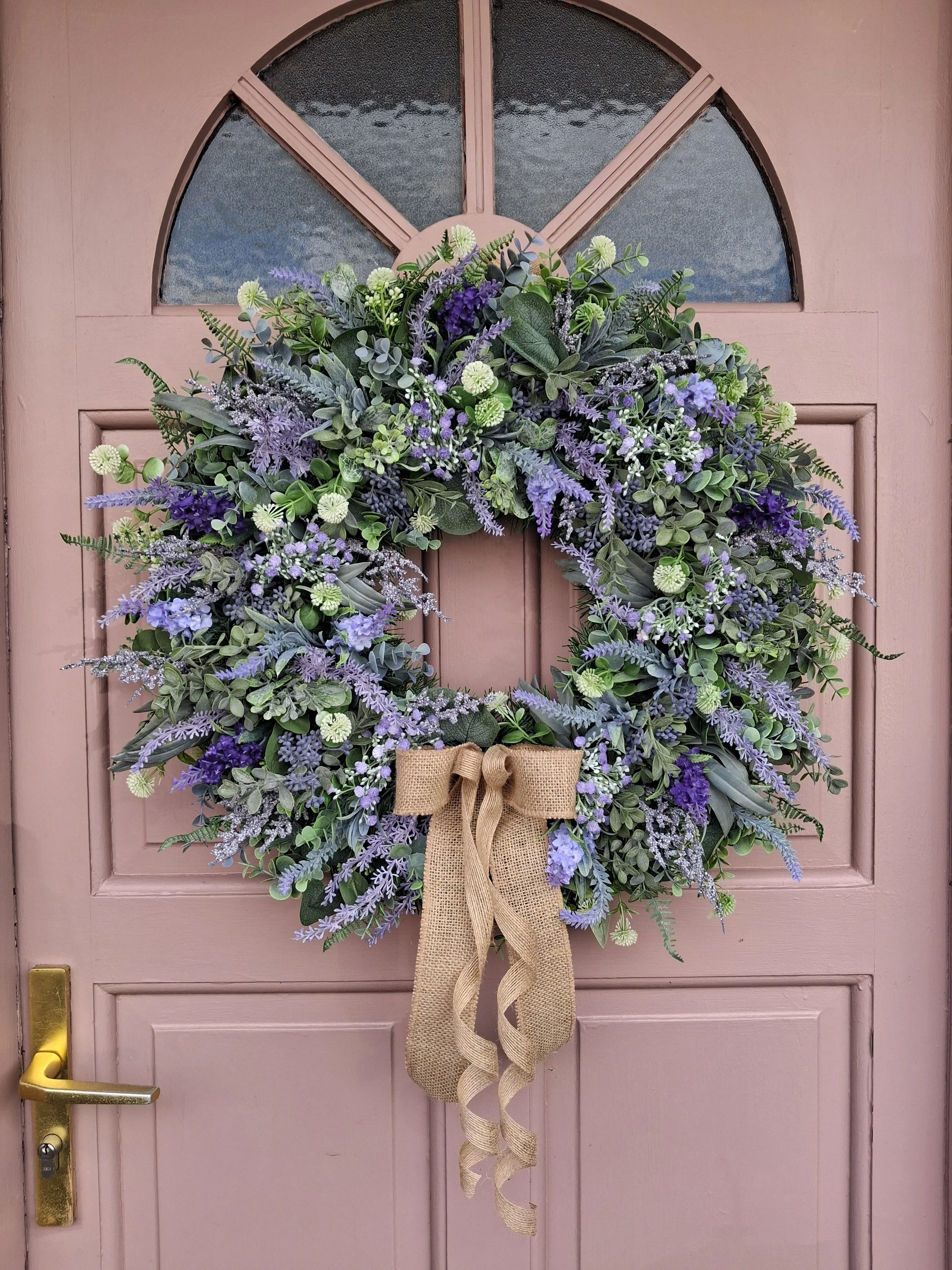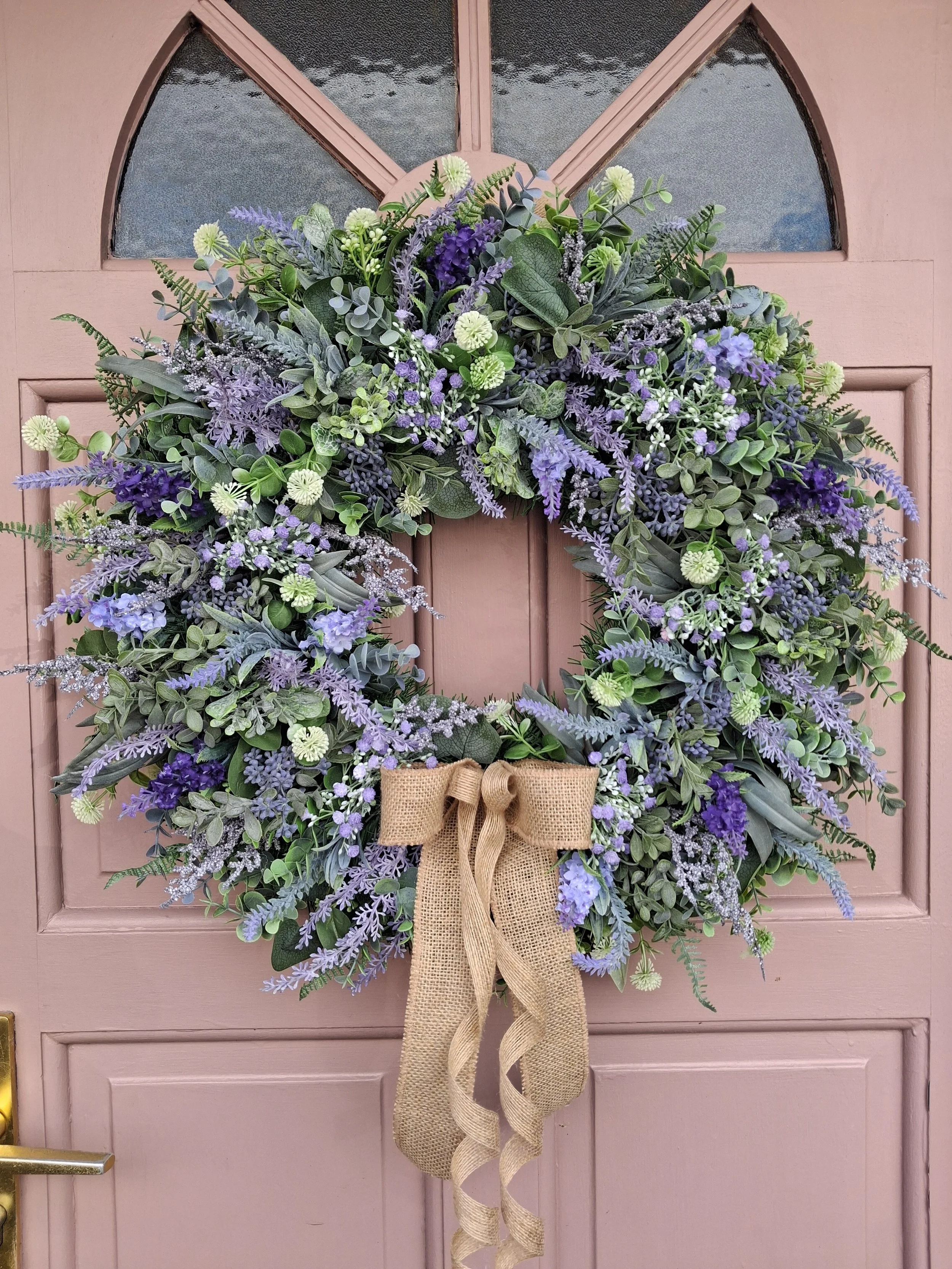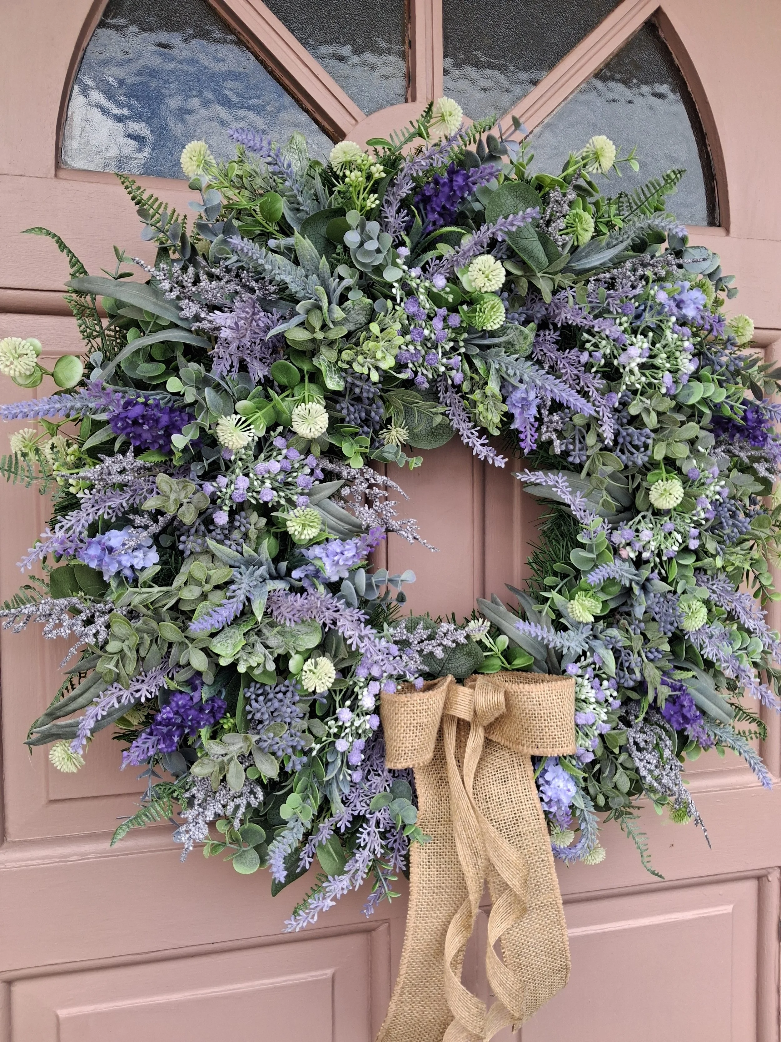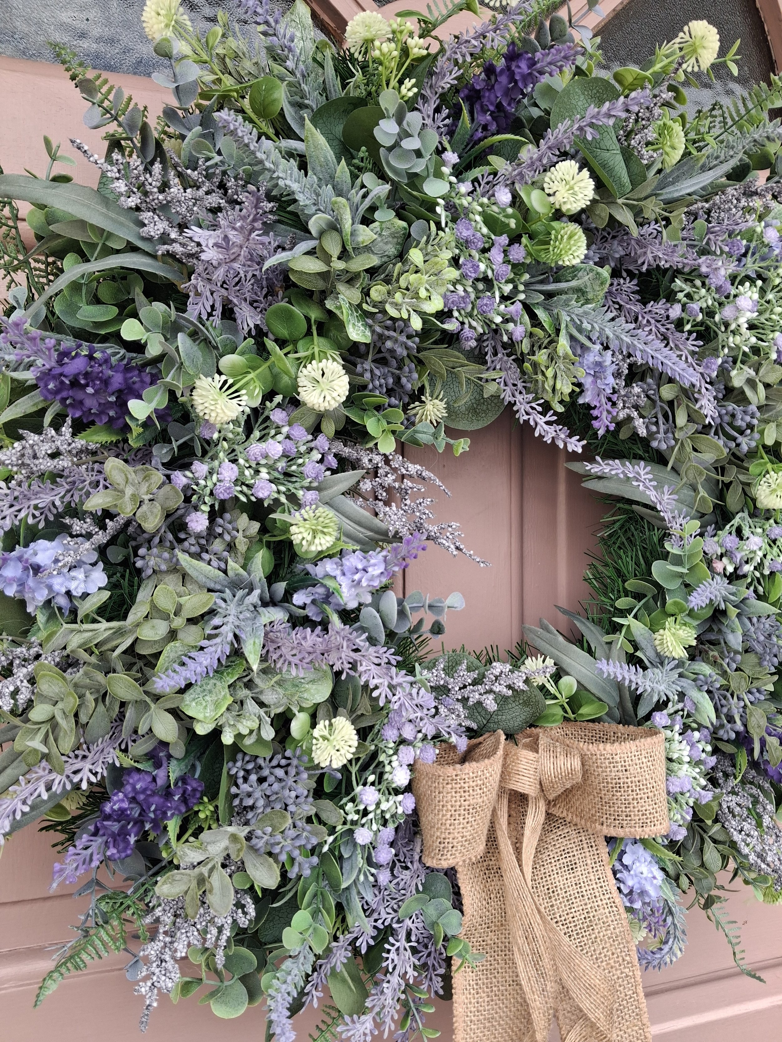 A timeless piece bursting full of foliage and lavender in various styles using the most realistic stems completed with a double burlap bow.