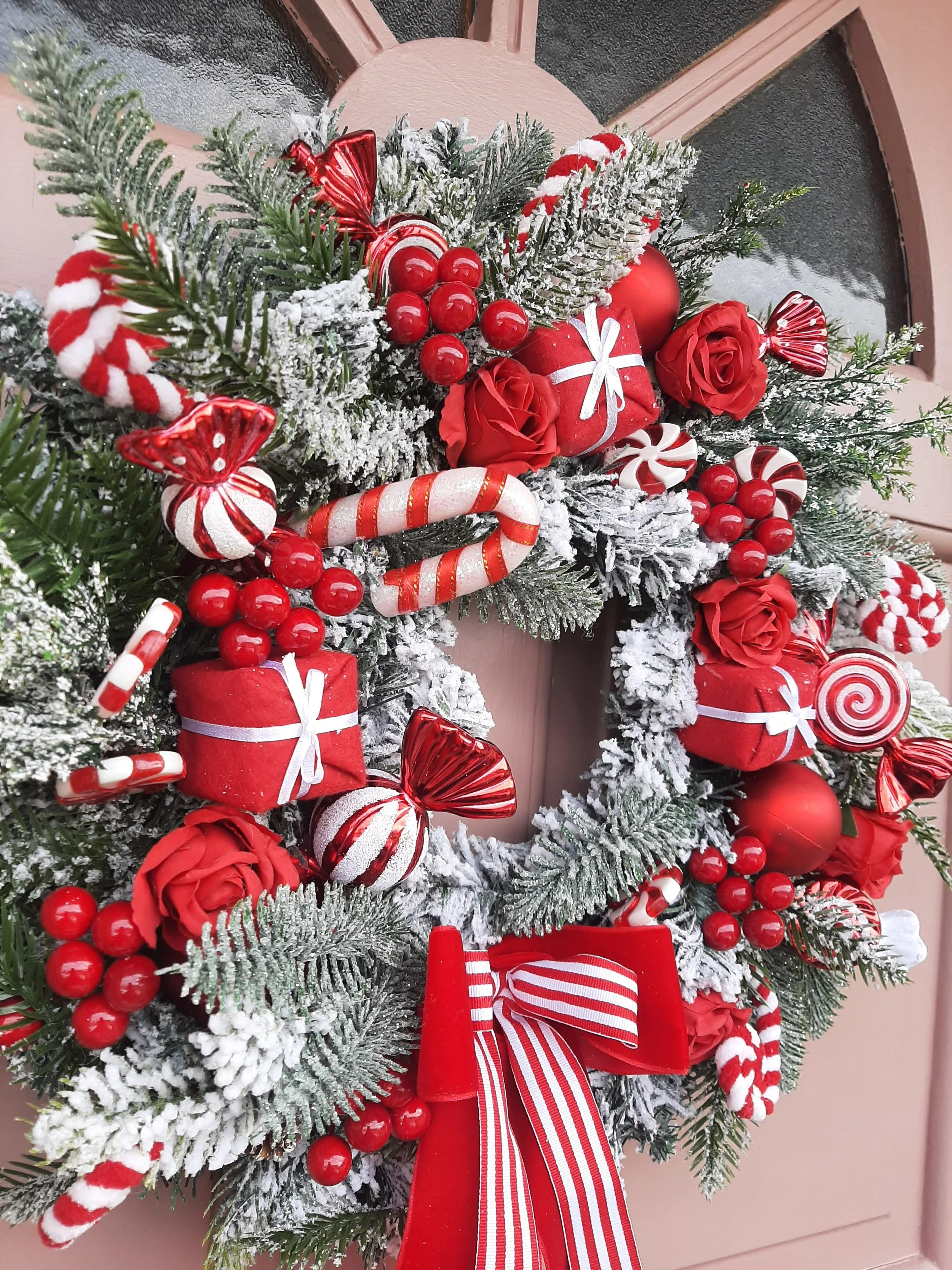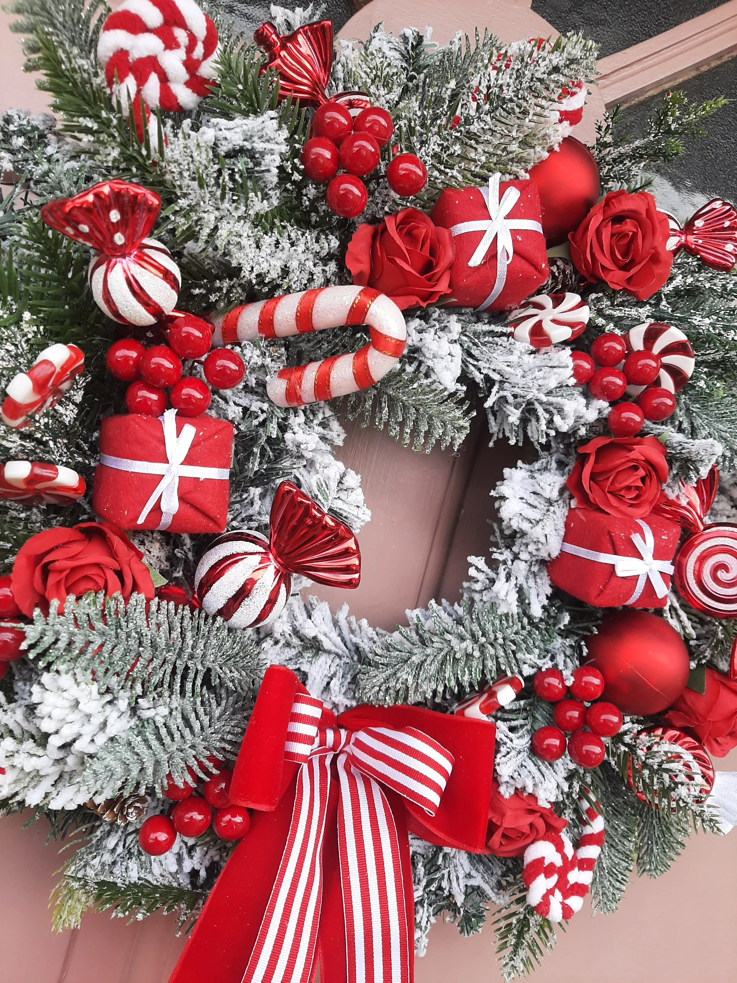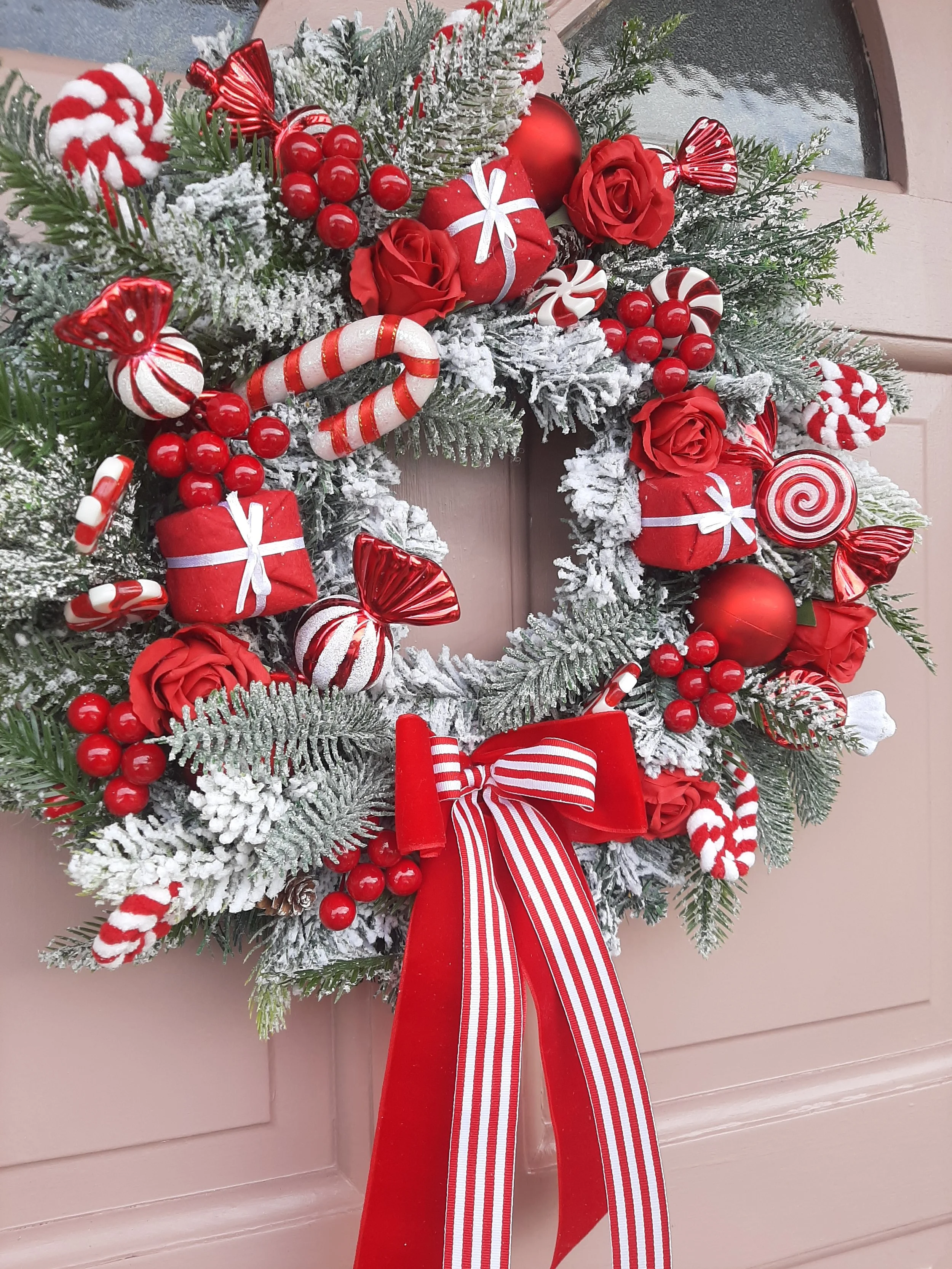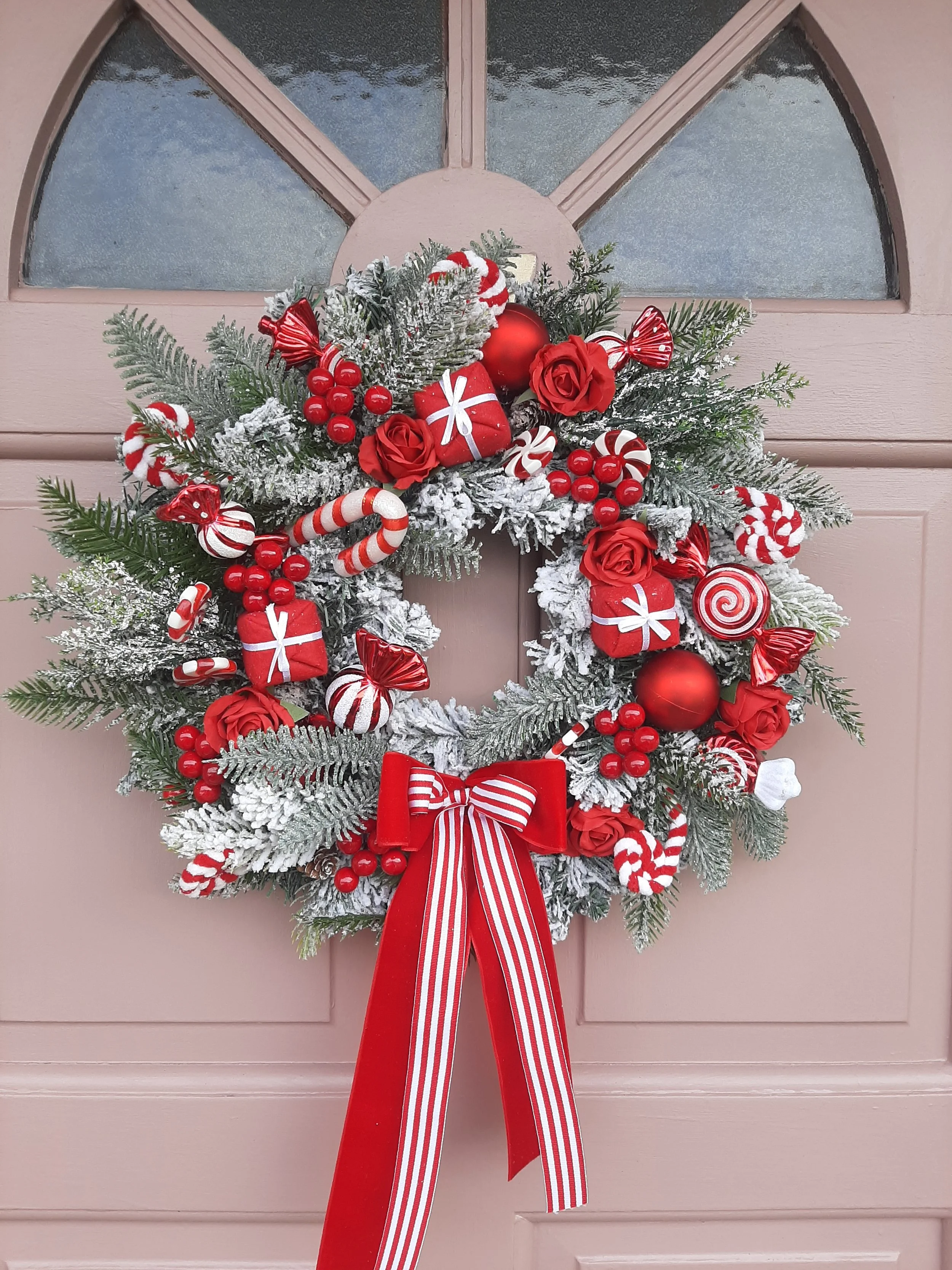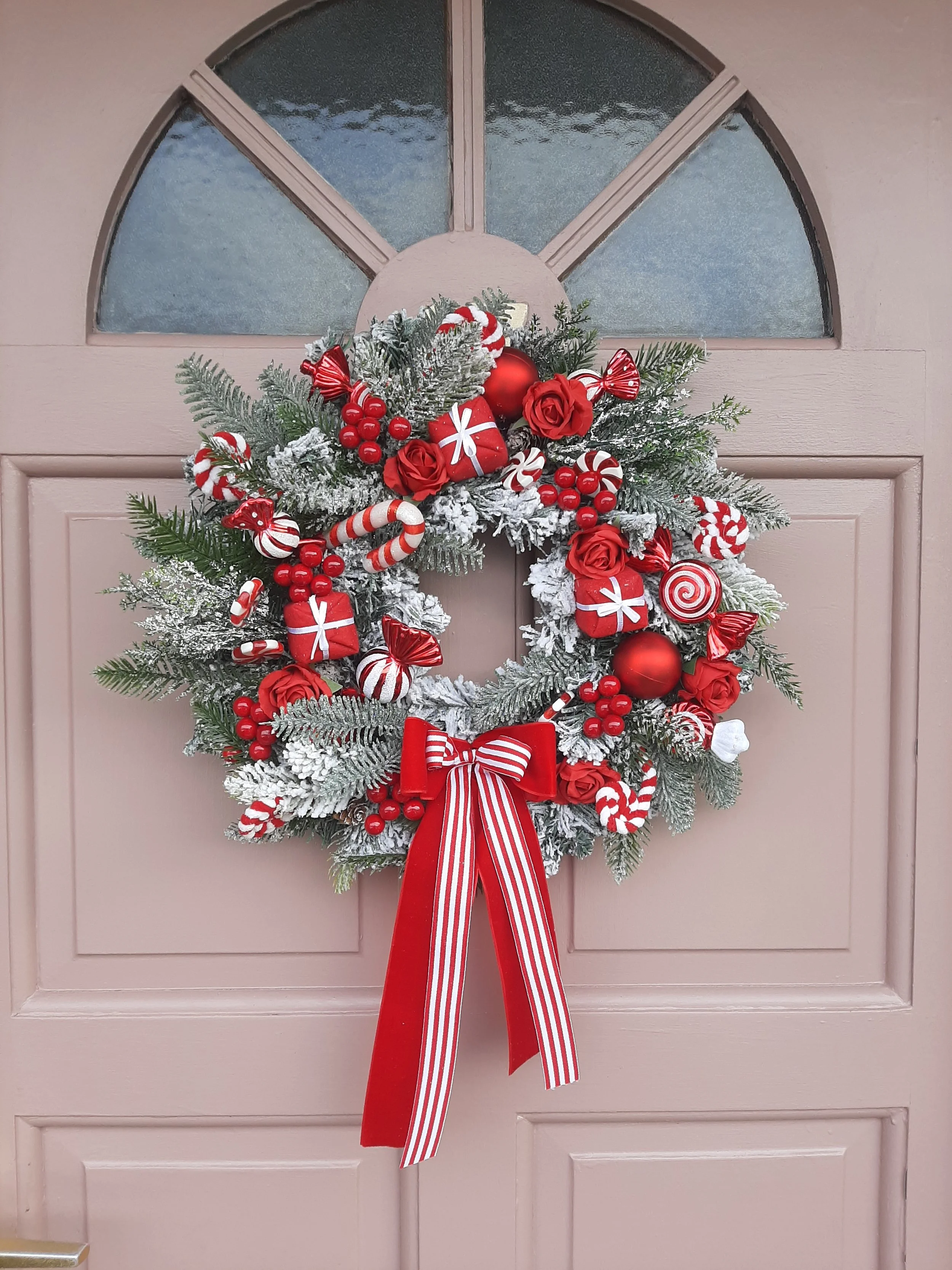 A fun style created with candy cane sweets and baubles completed with a double bow in red velvet and candy cane stripe.