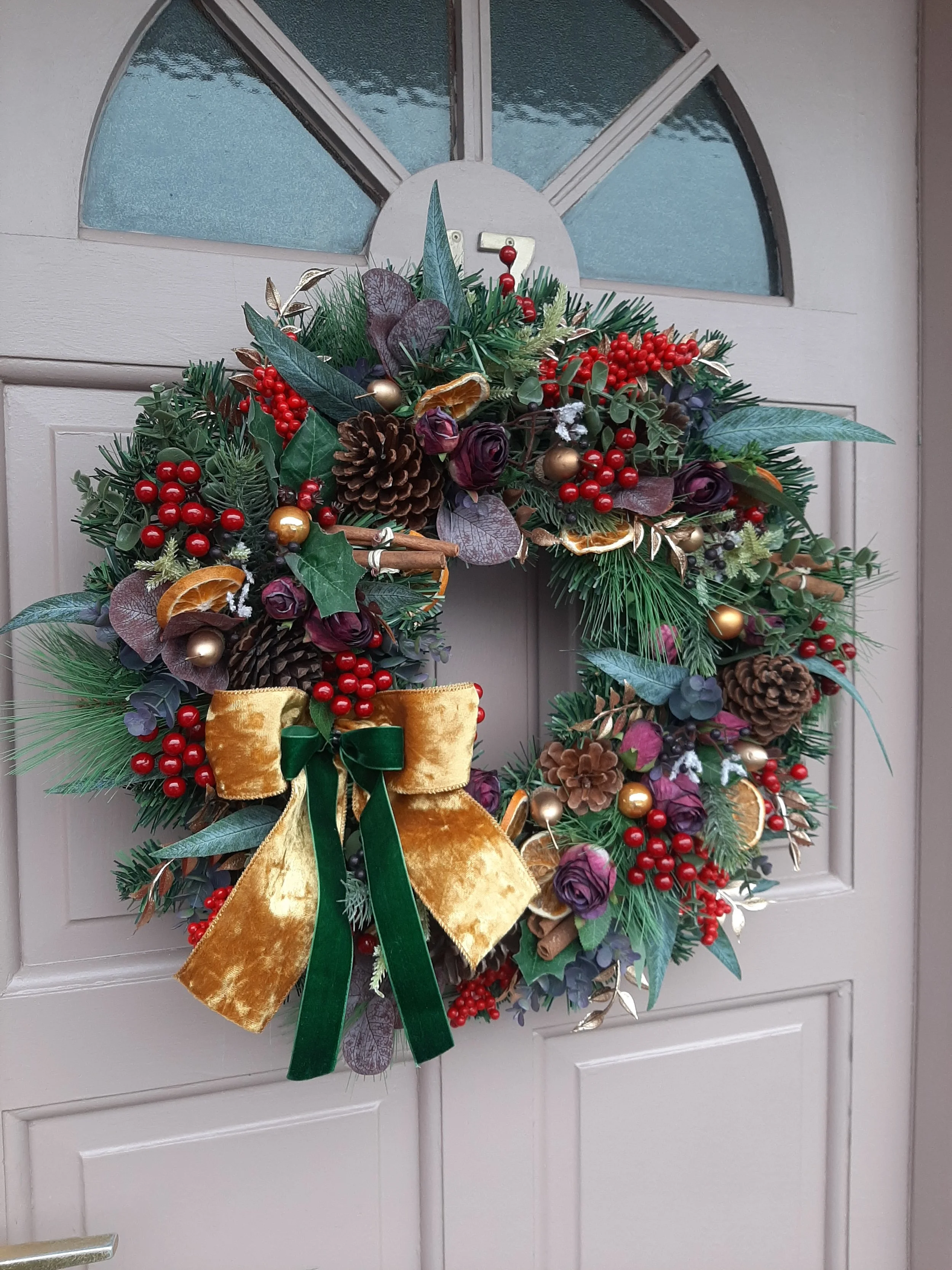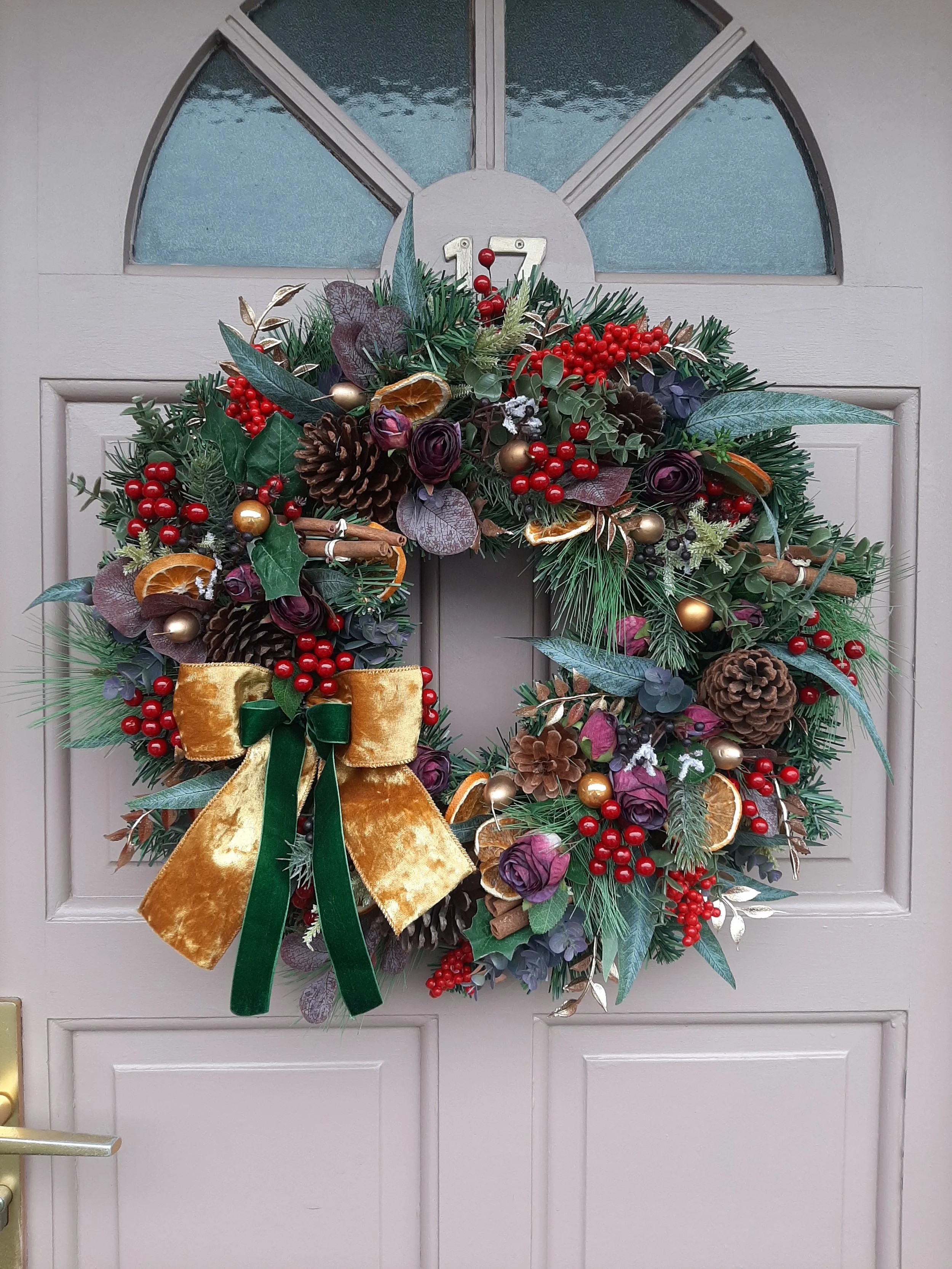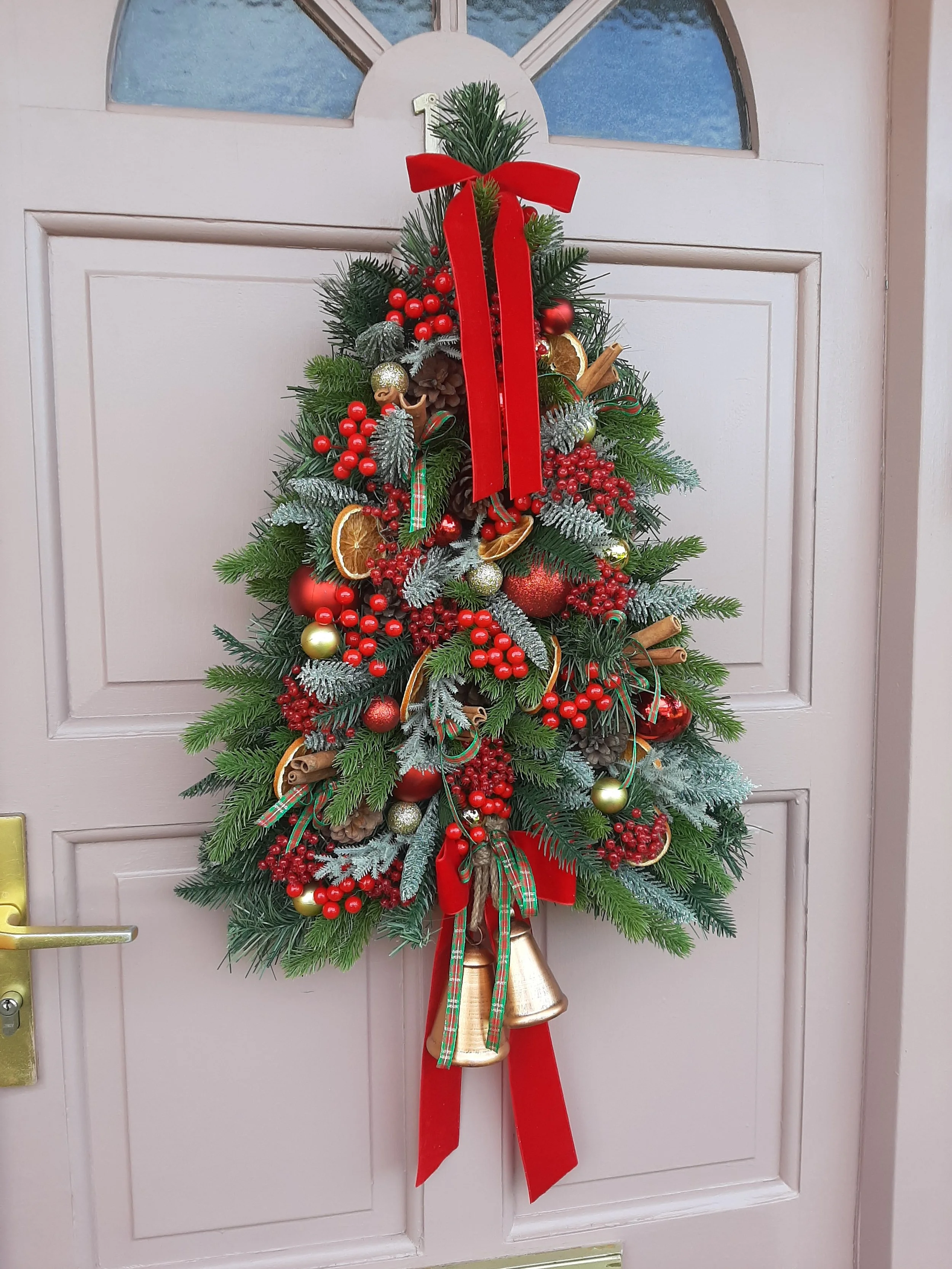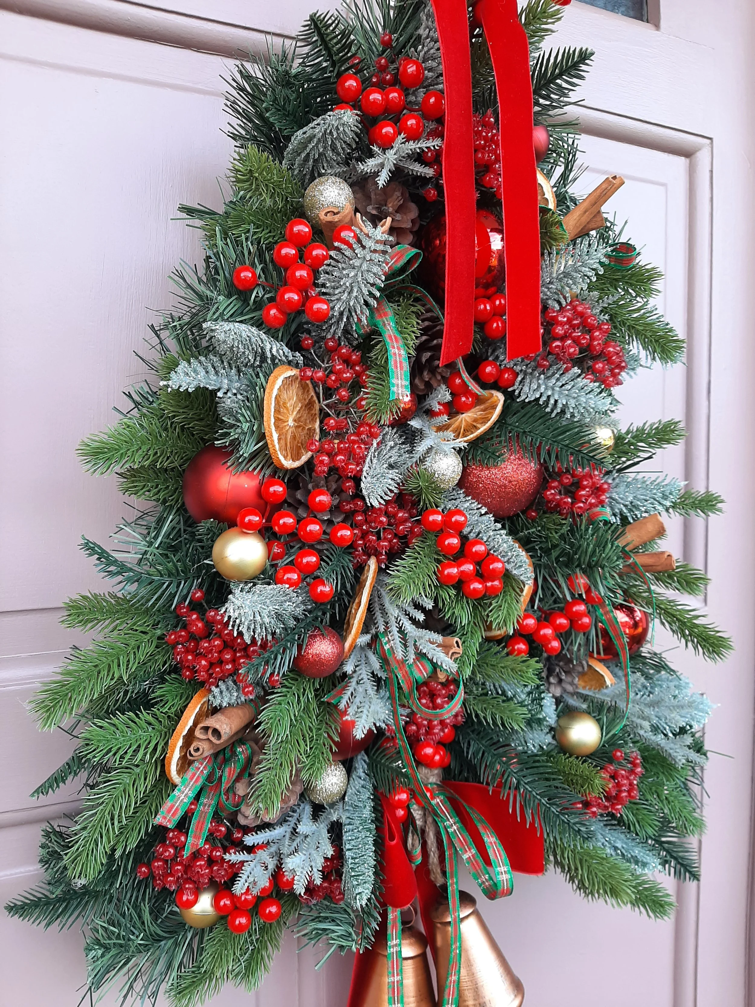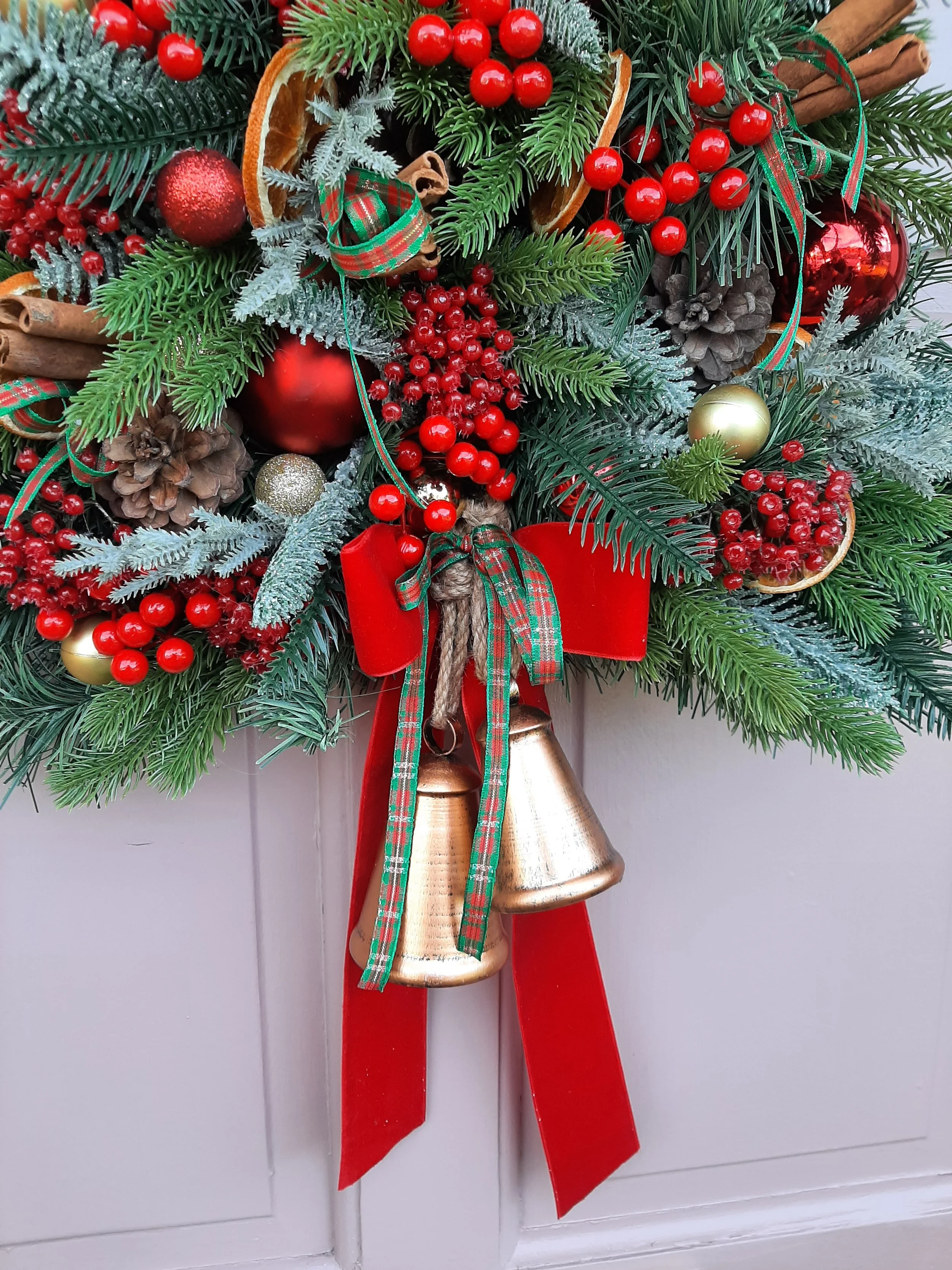 Created using an abundance of seasonal foliage, orange slices, berries, baubles and cinnamon sticks completed with red velvet bows and stunning bells.
