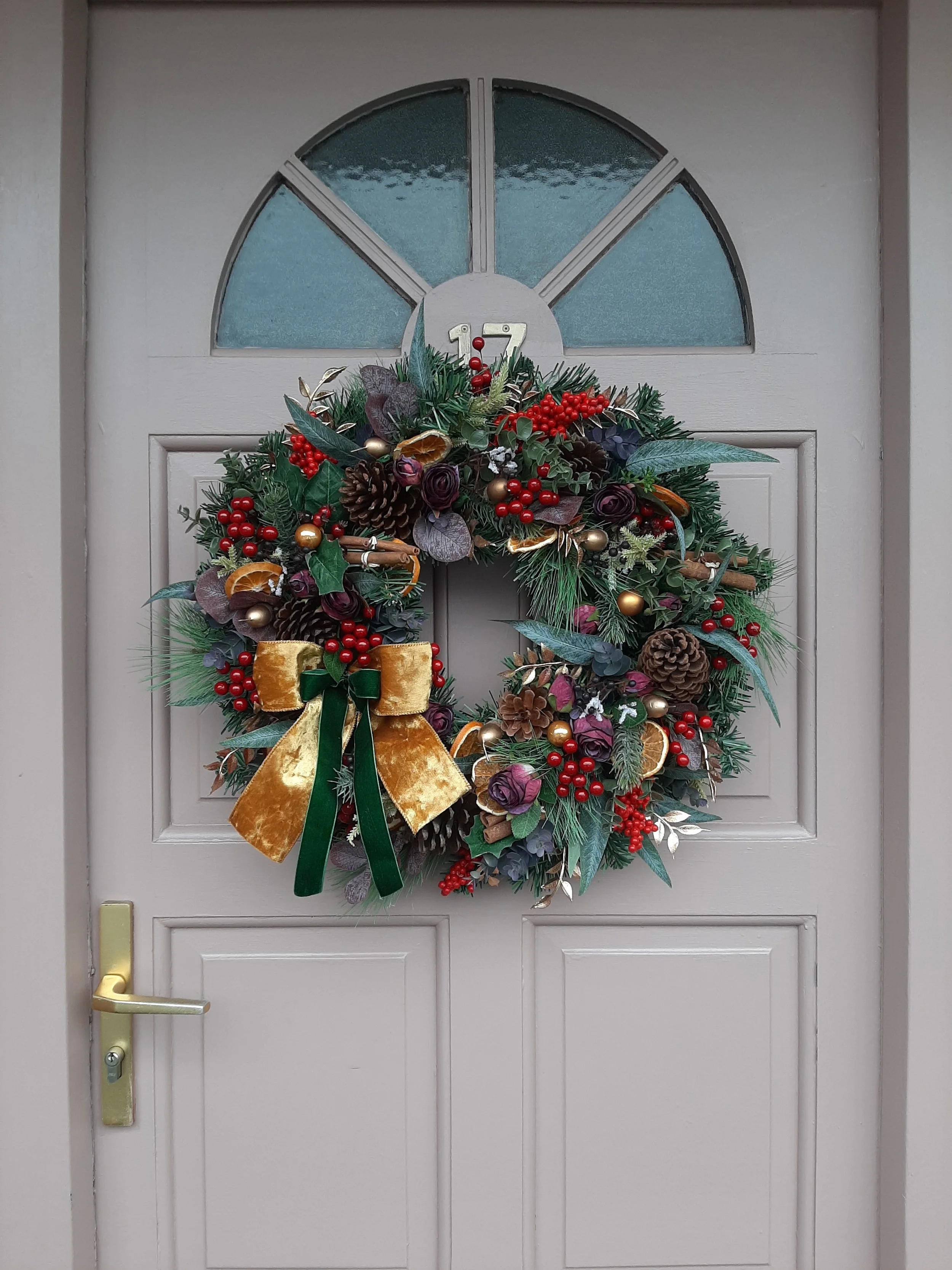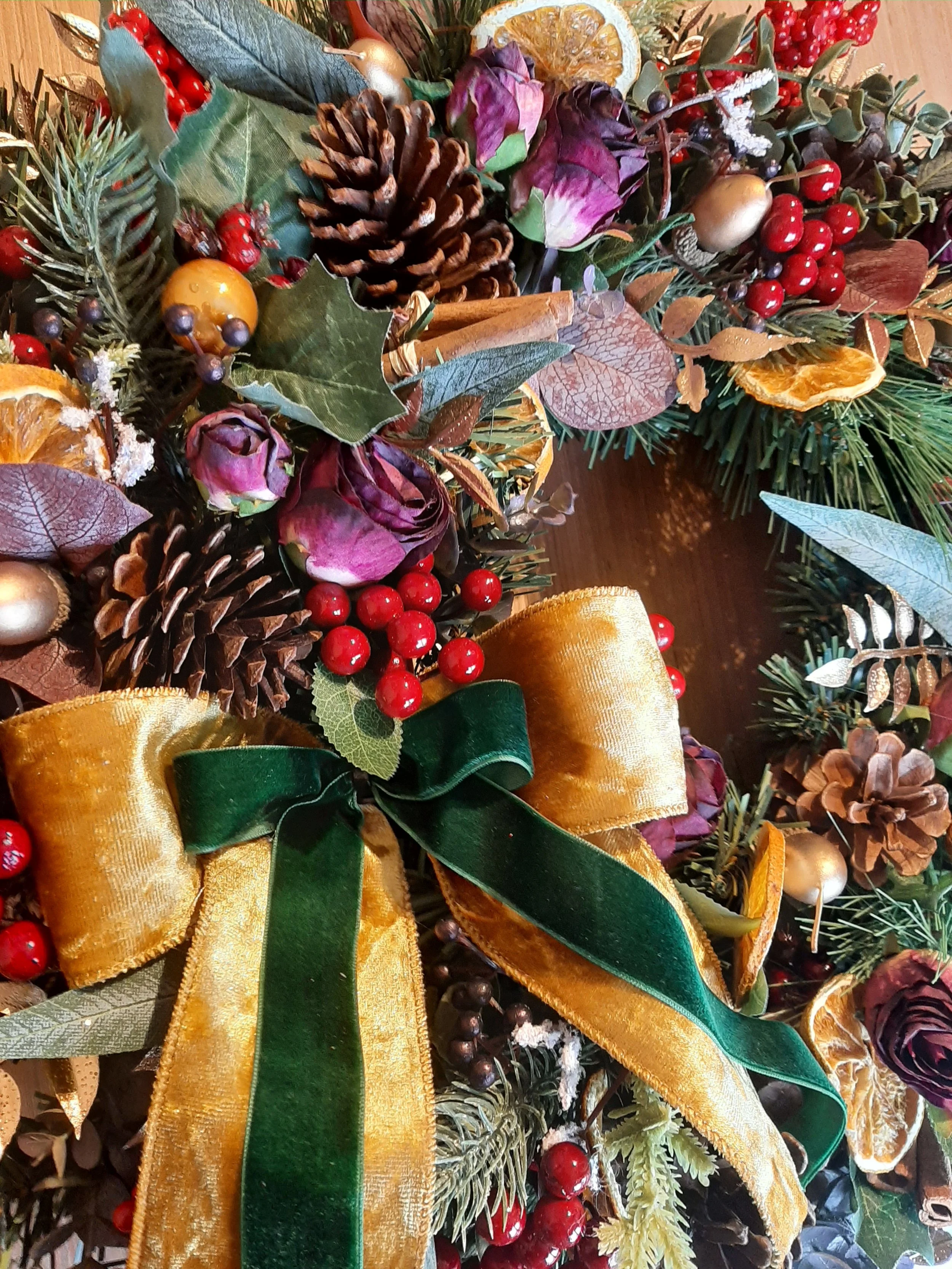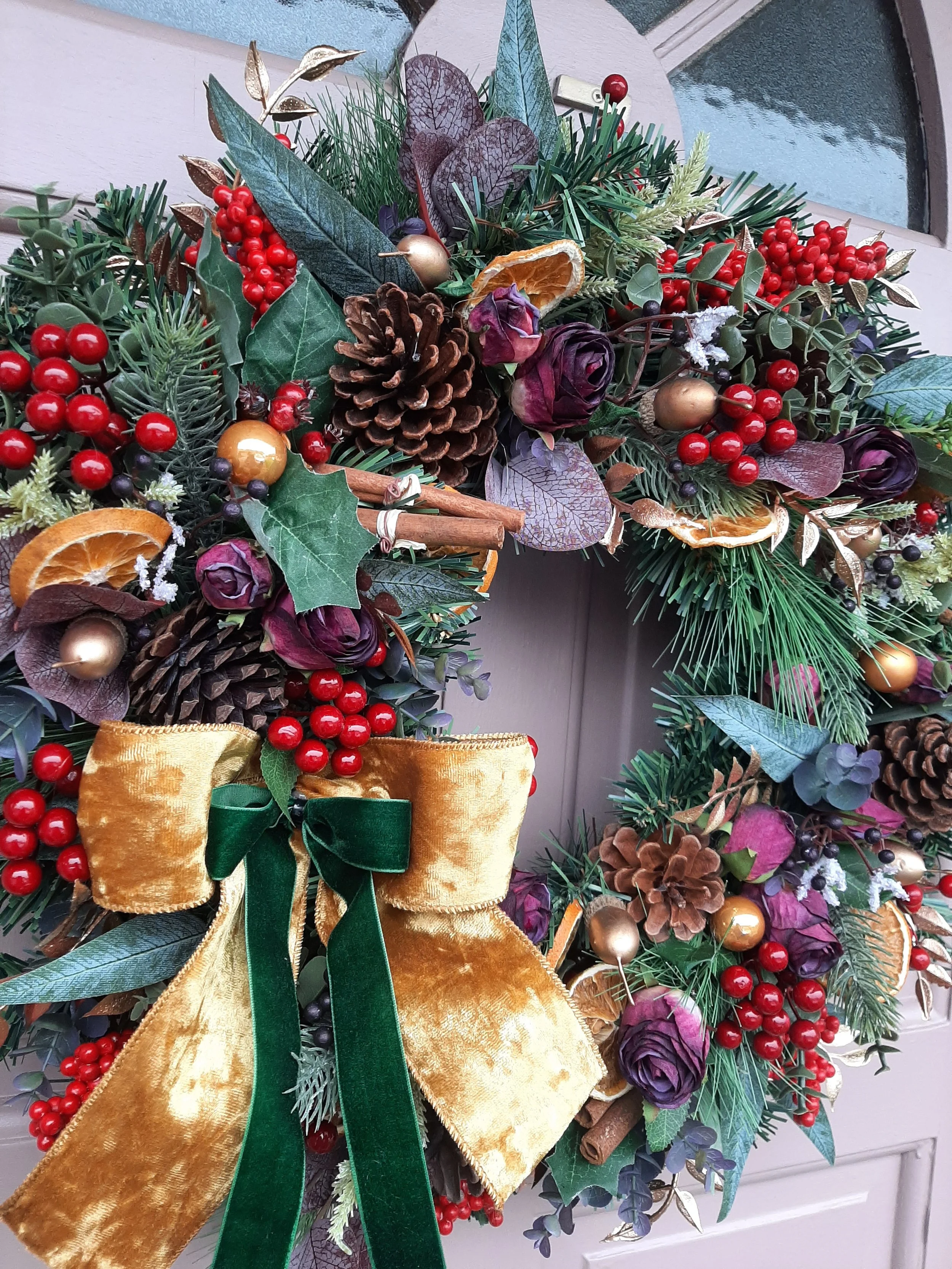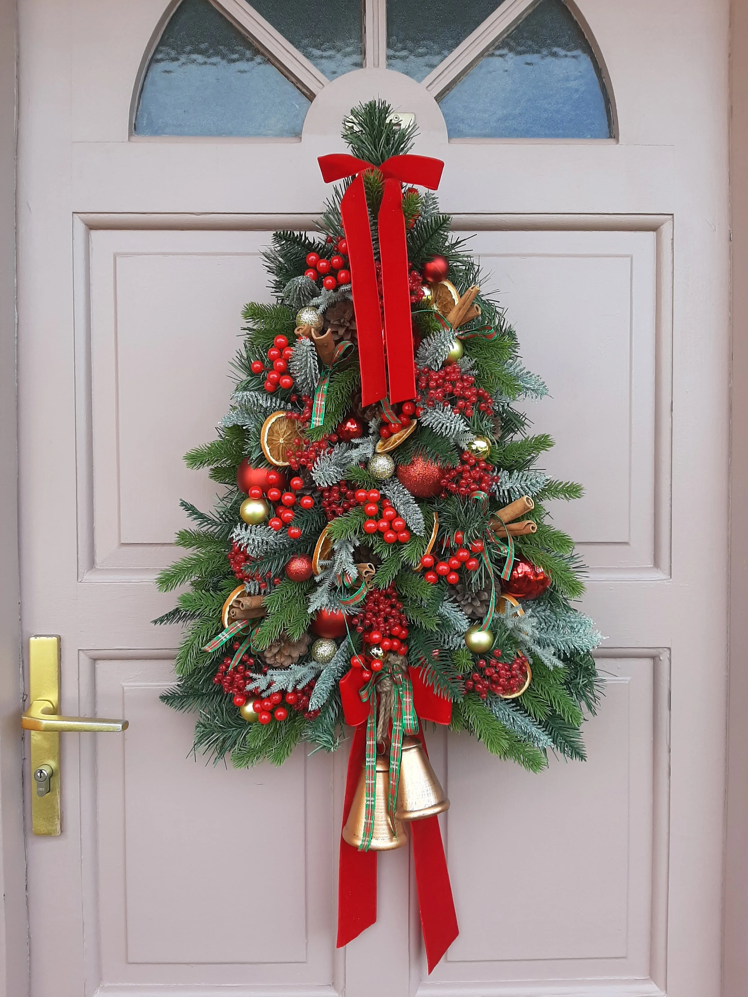 Created using an abundance of seasonal foliage, orange slices, berries, baubles and cinnamon sticks completed with red velvet bows and stunning bells.