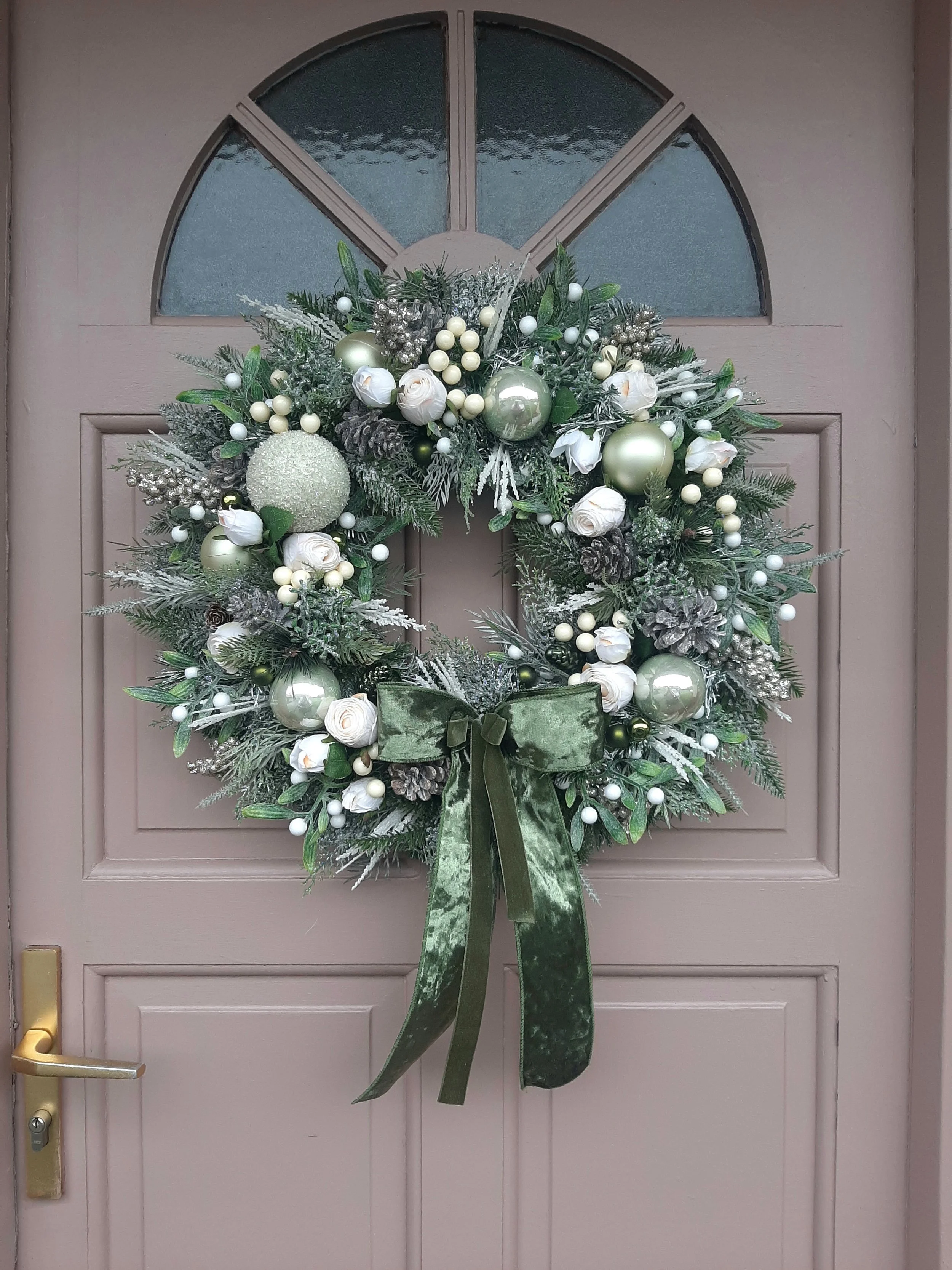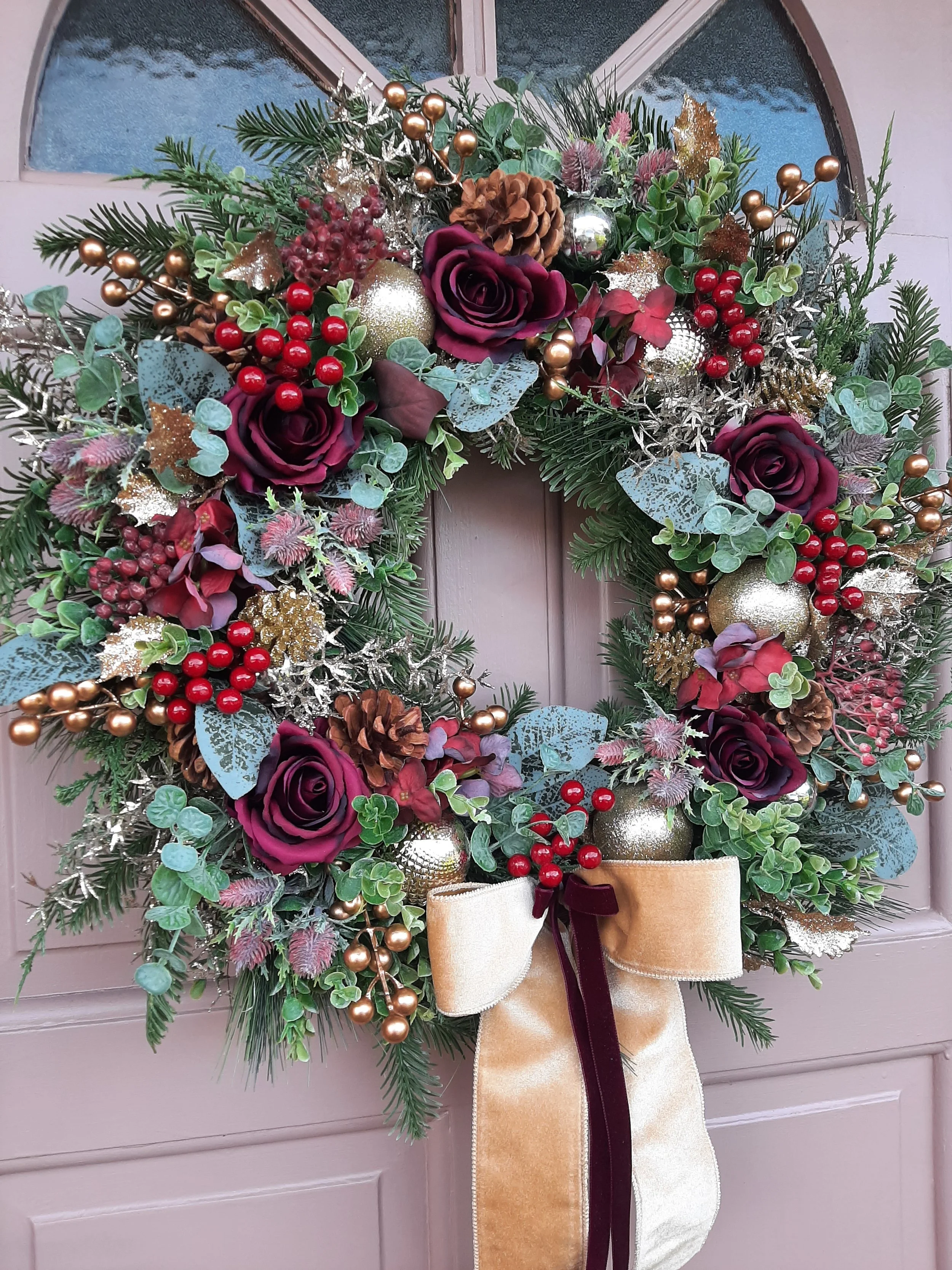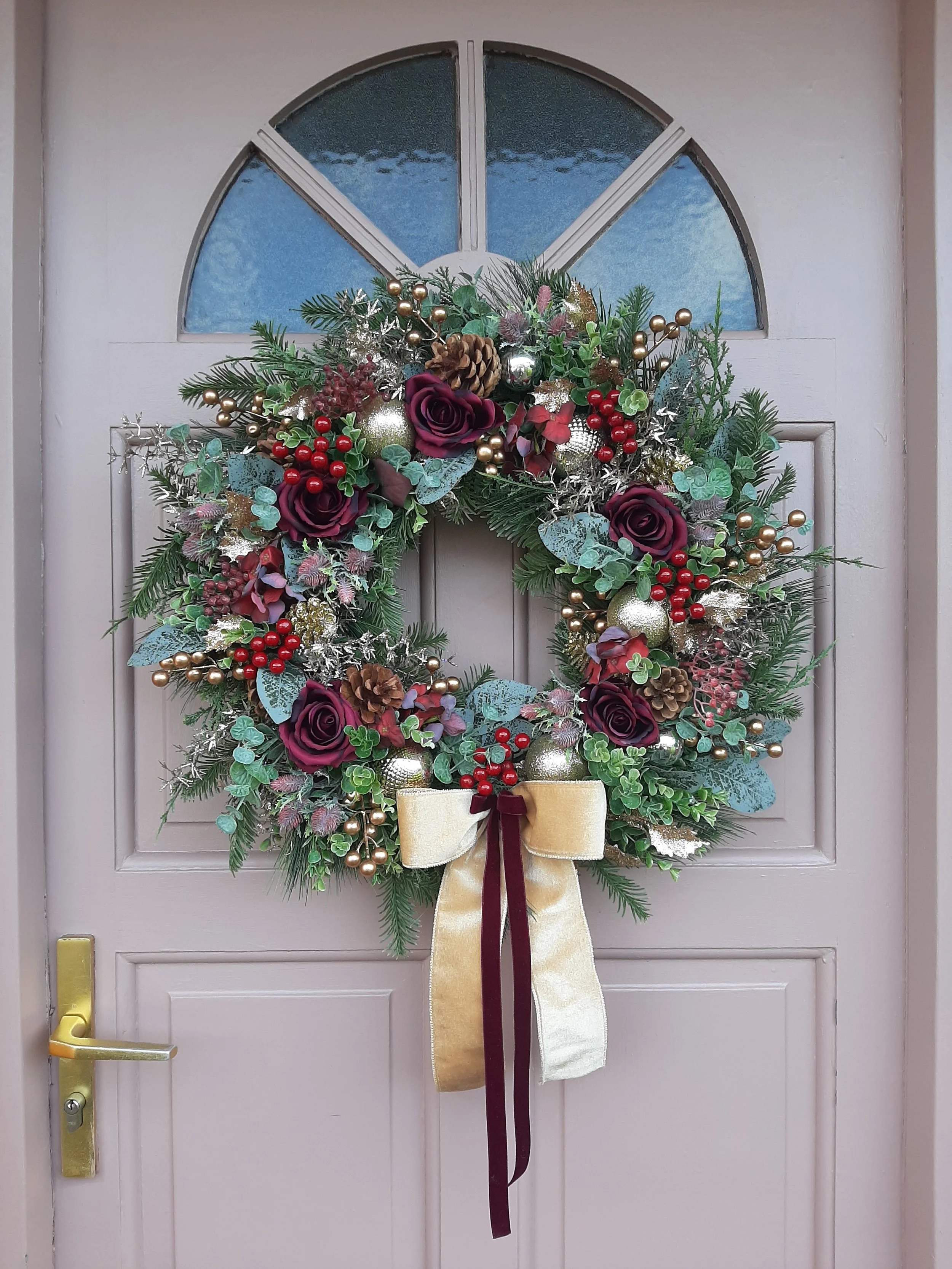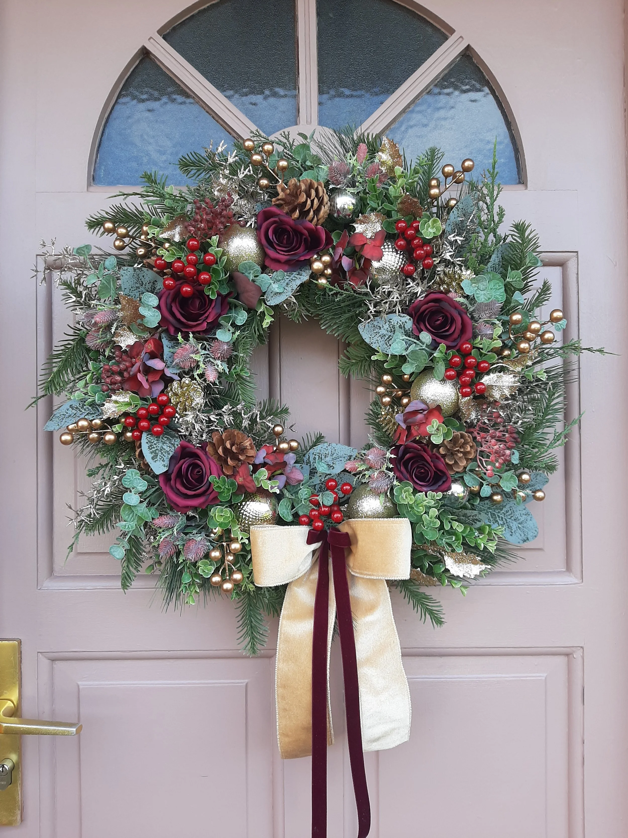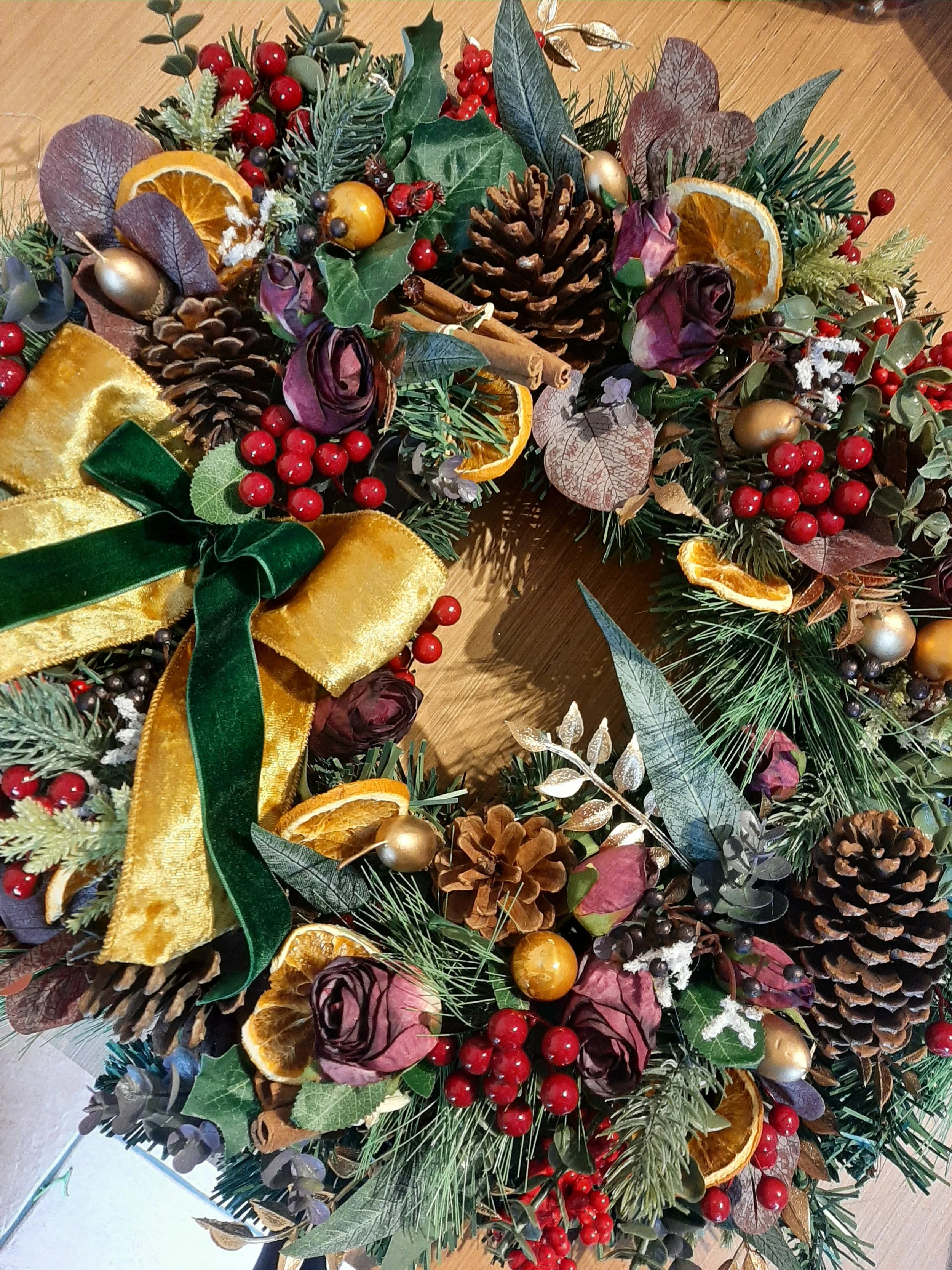Created using an abundance of seasonal foliage, orange slices, berries, baubles and cinnamon sticks completed with red velvet bows and stunning bells.