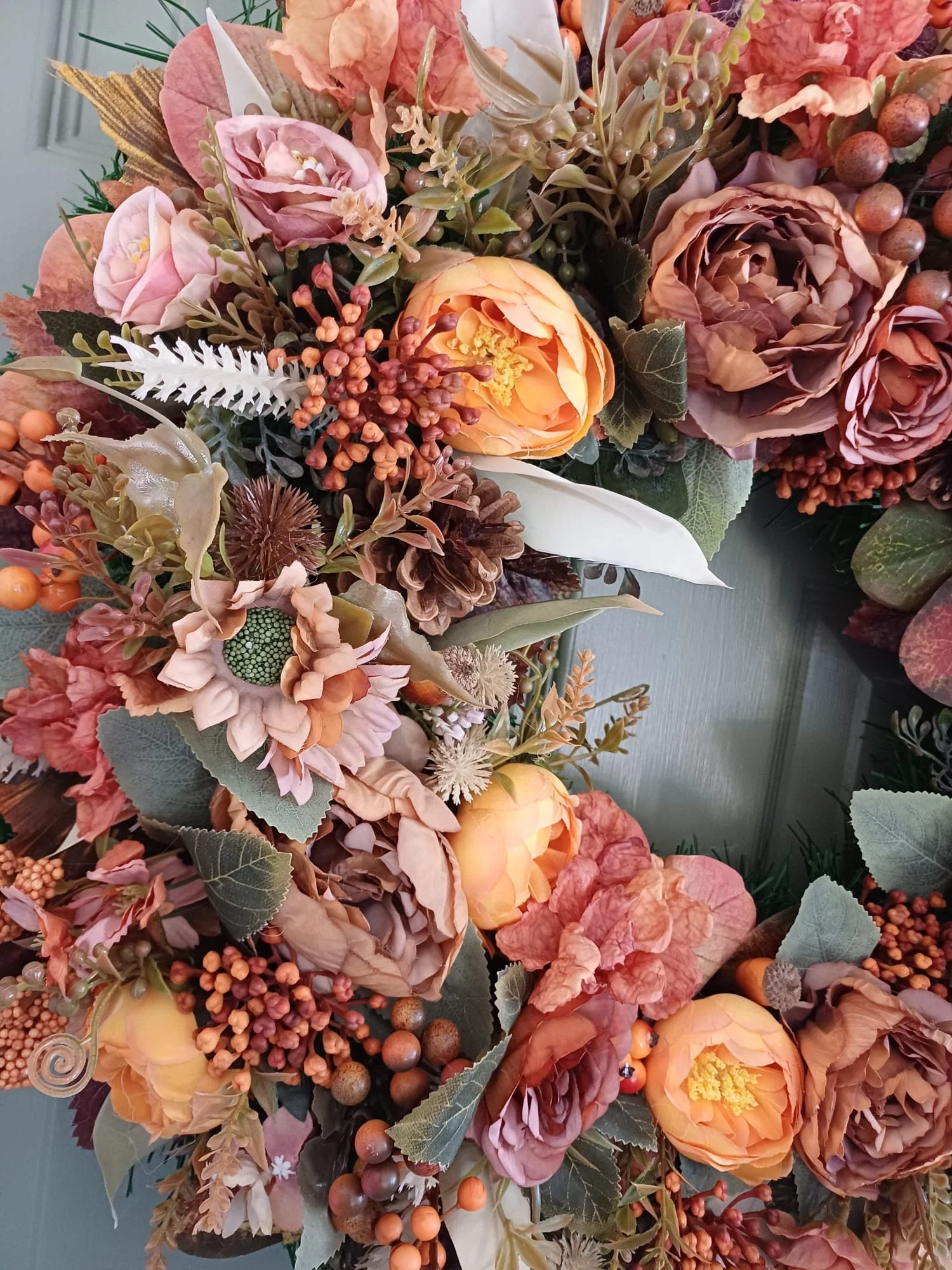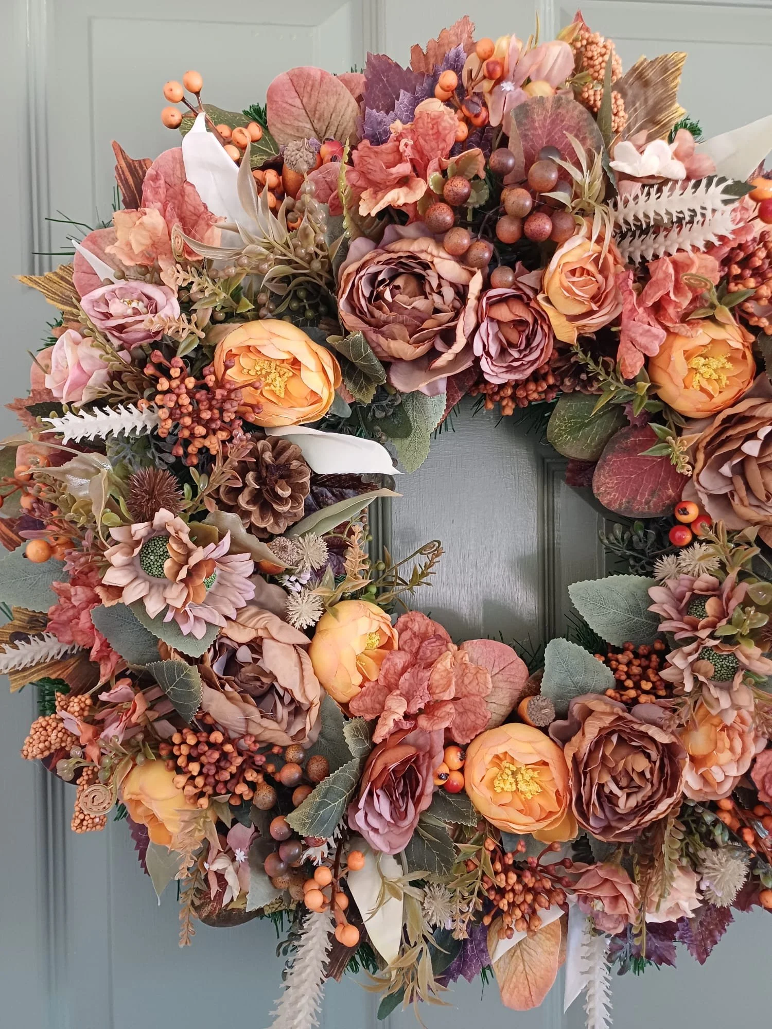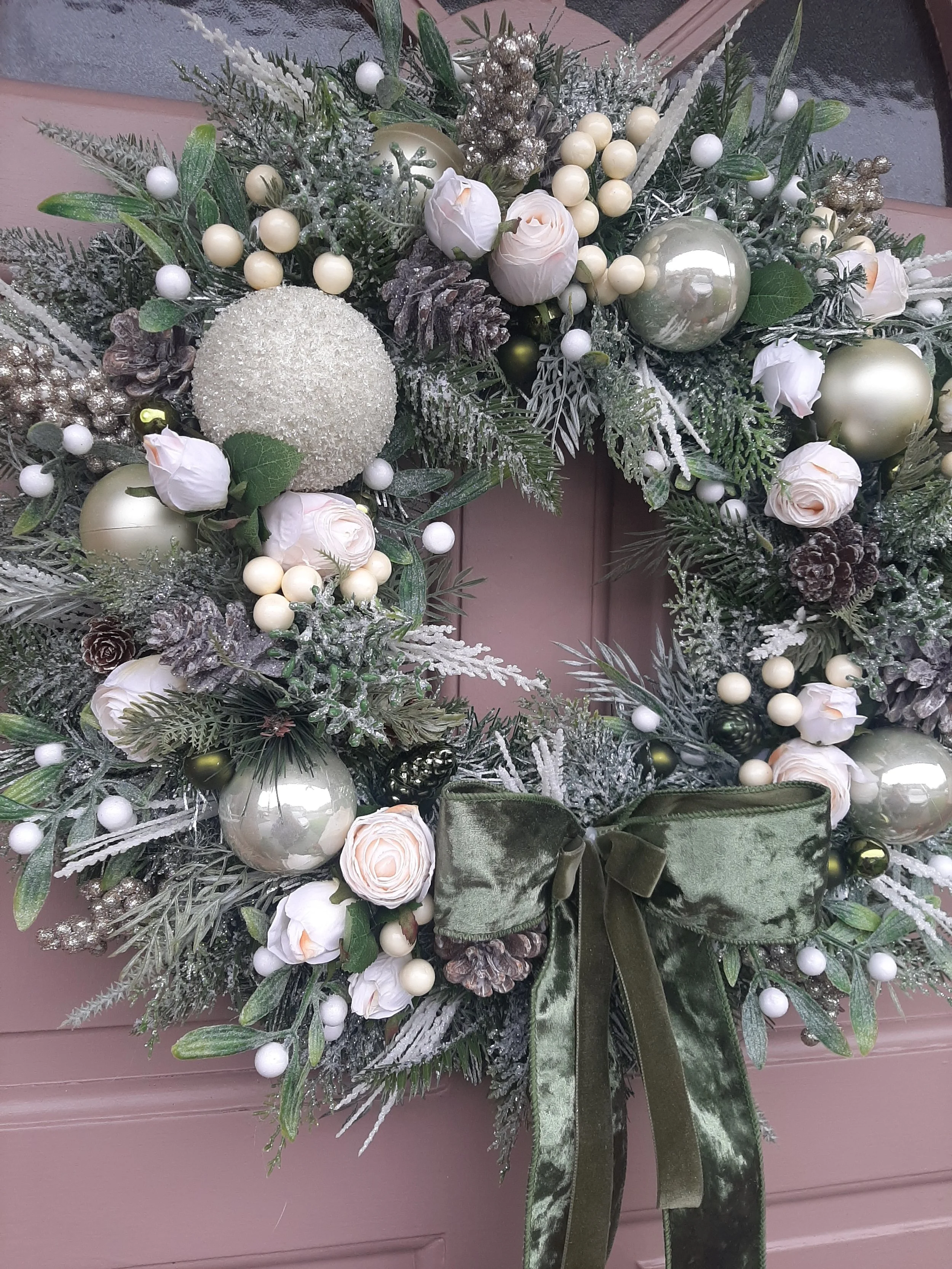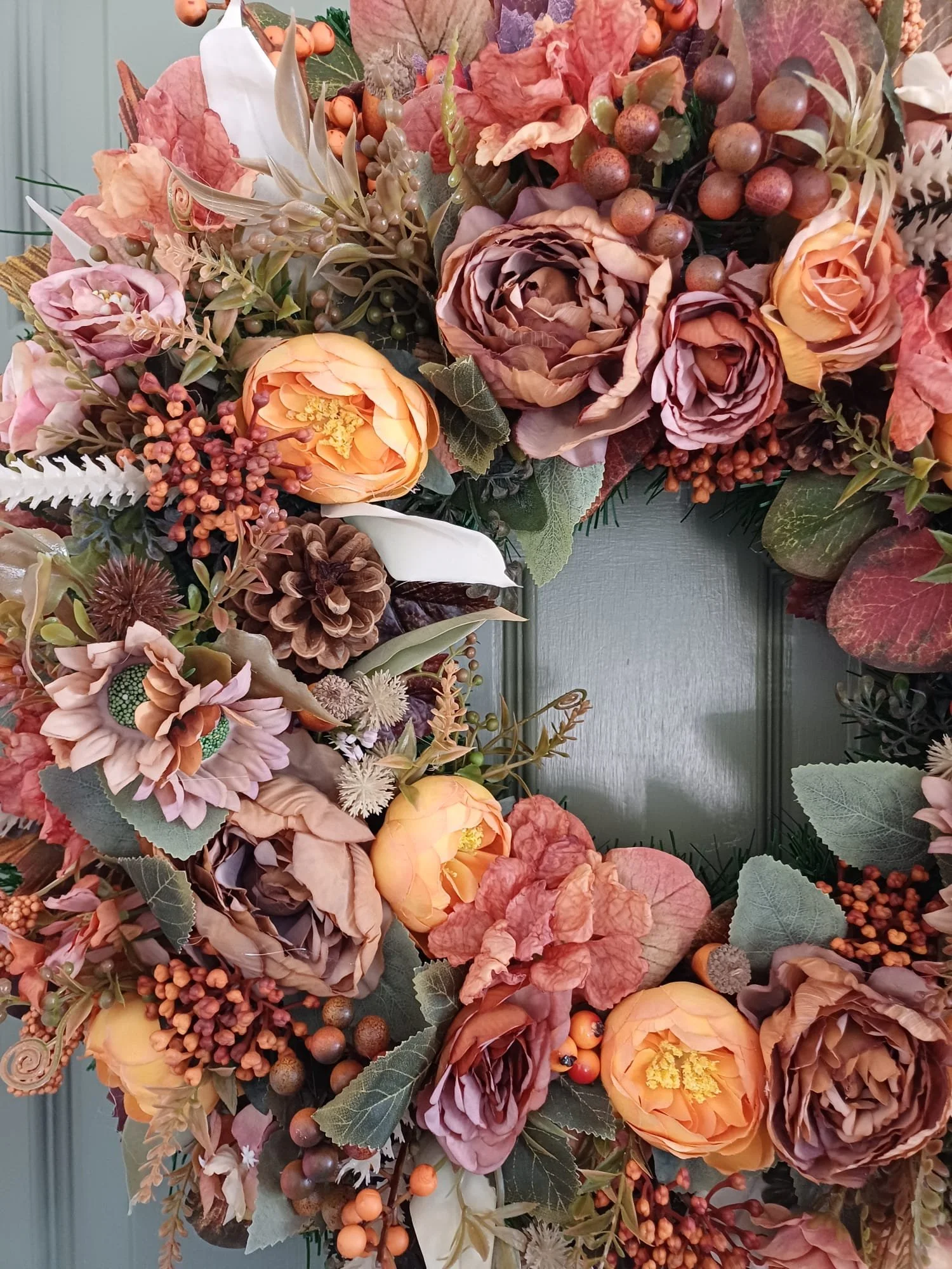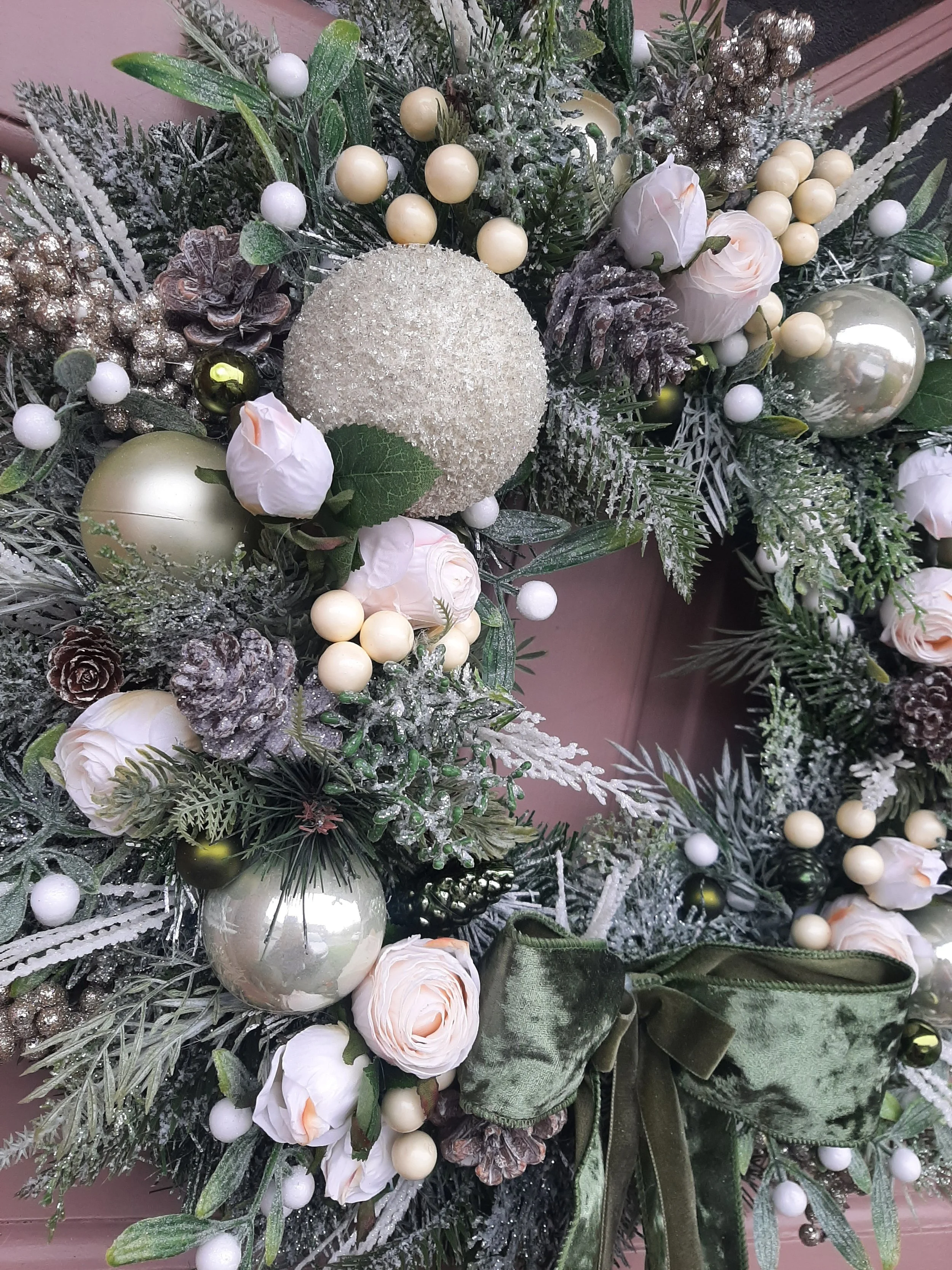 Created using an abundance of seasonal foliage, orange slices, berries, baubles and cinnamon sticks completed with red velvet bows and stunning bells.