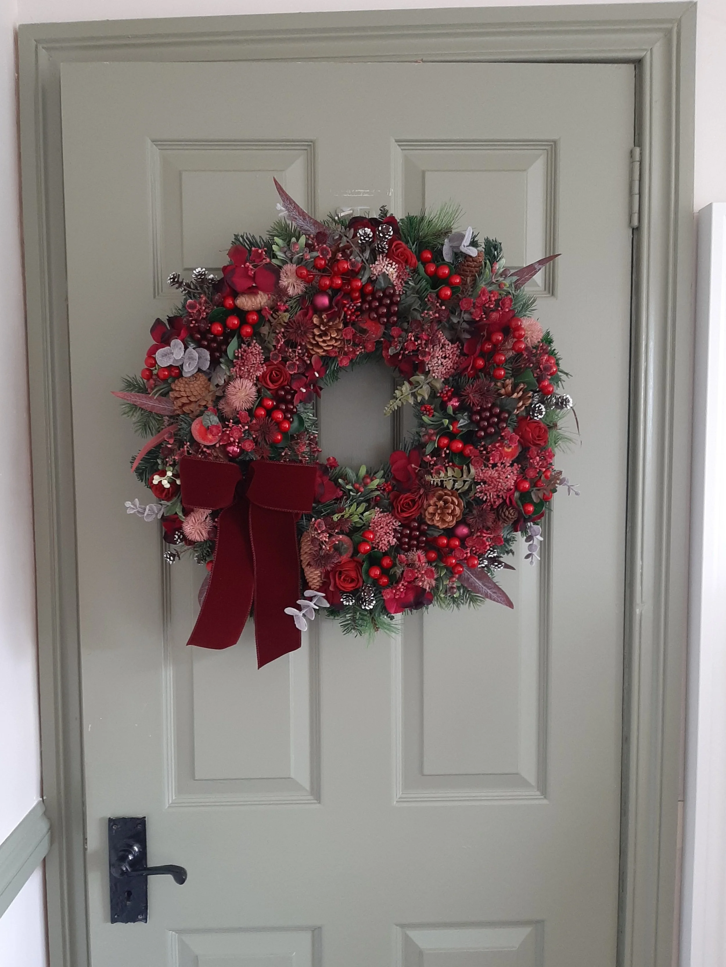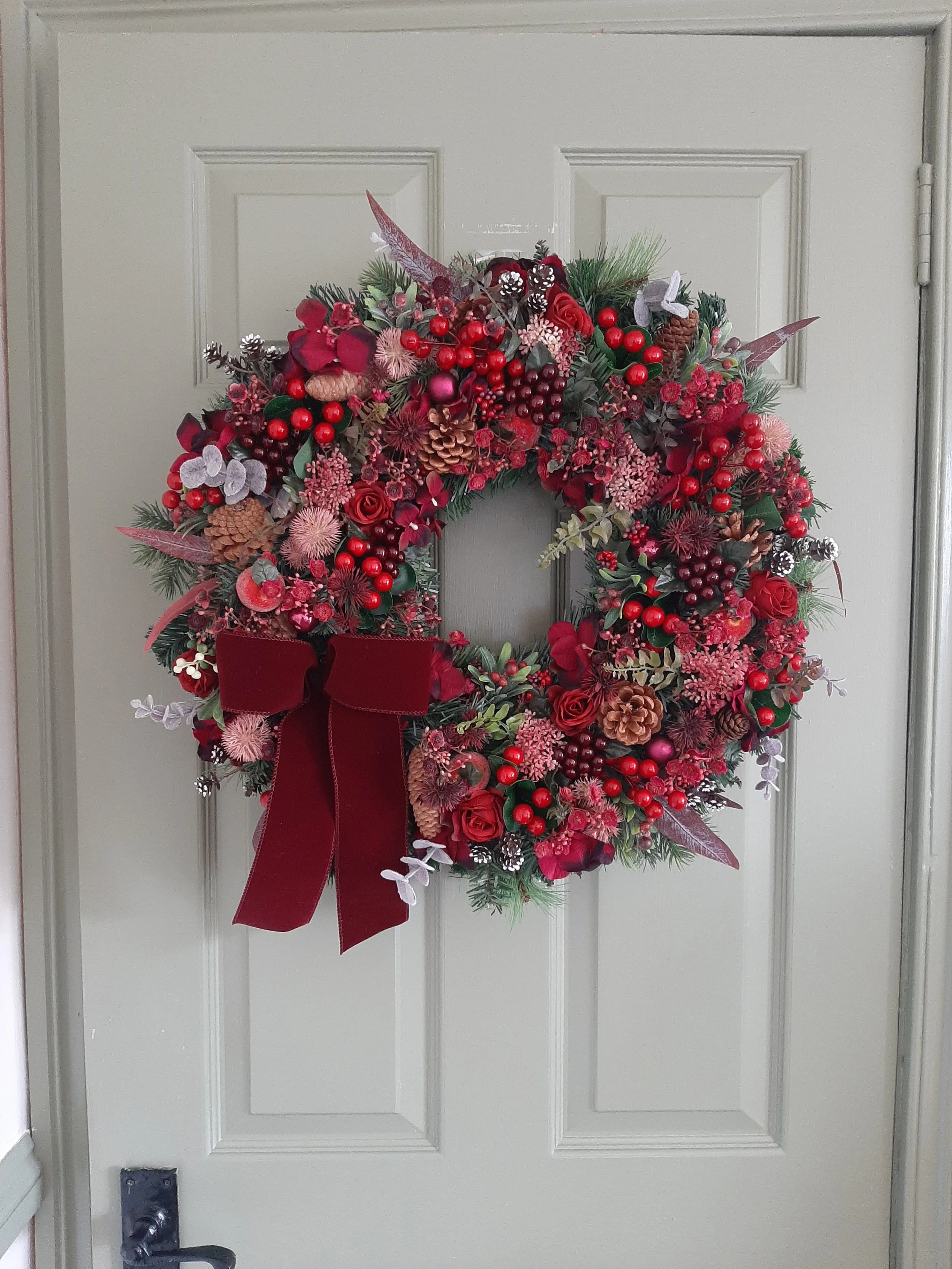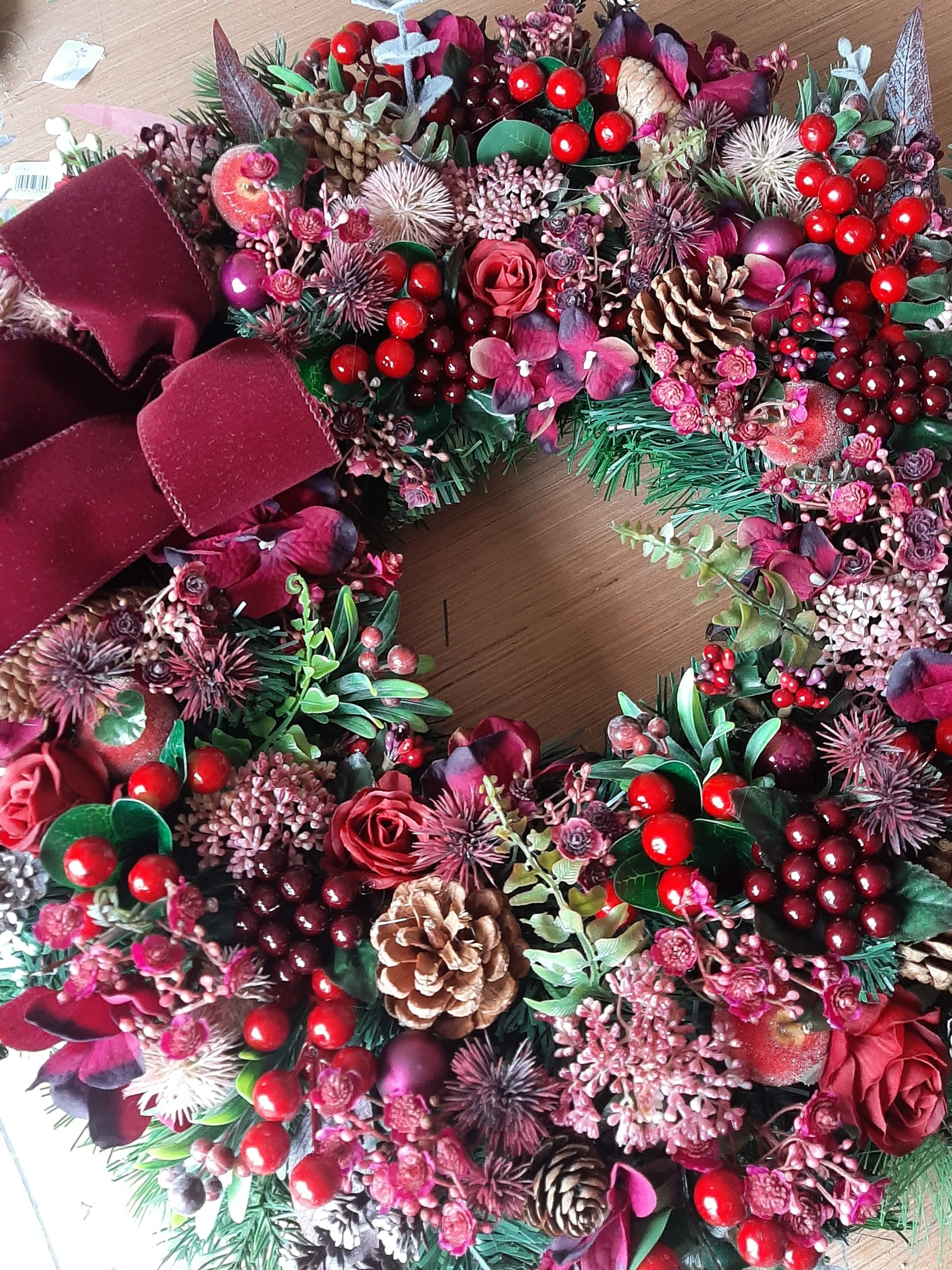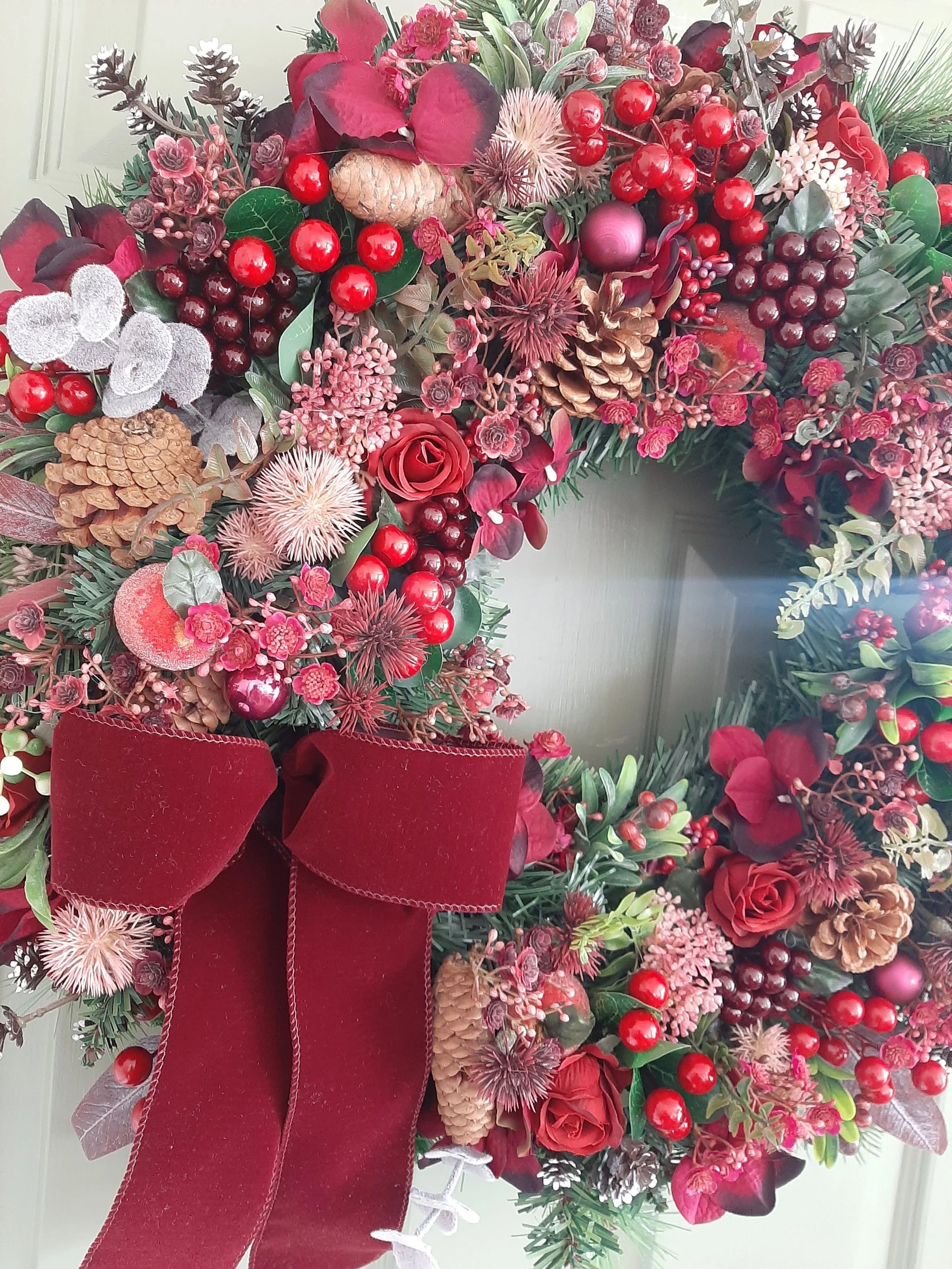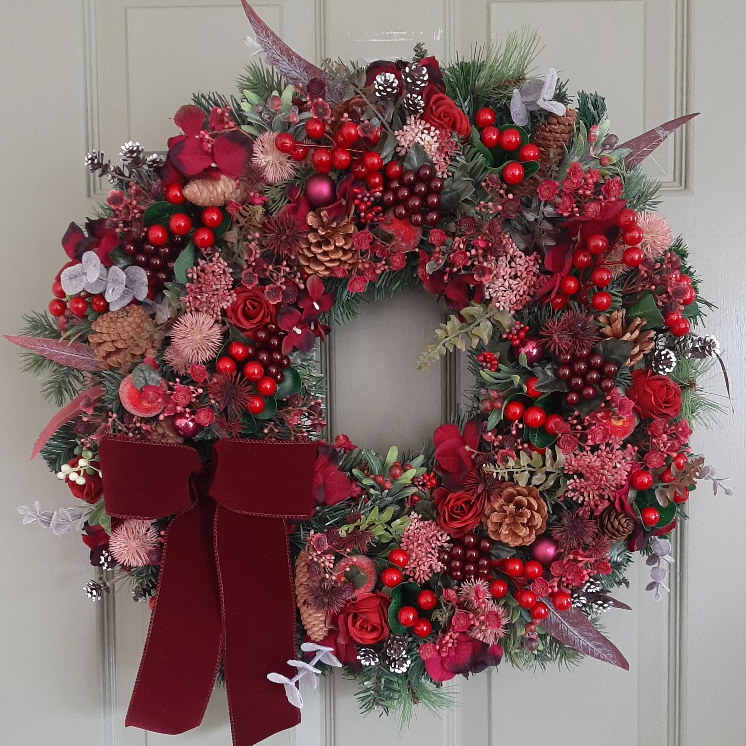 Burgundy is the colour of the season and this one is oozing it in every tone and texture! From traditional reds to pops of magenta including eucalyptus, laurel, elderflower, gypsophila, berries, thistle, mini snow pinecones and frosted apples. Designed on a double layered base for extra fullness and impact.