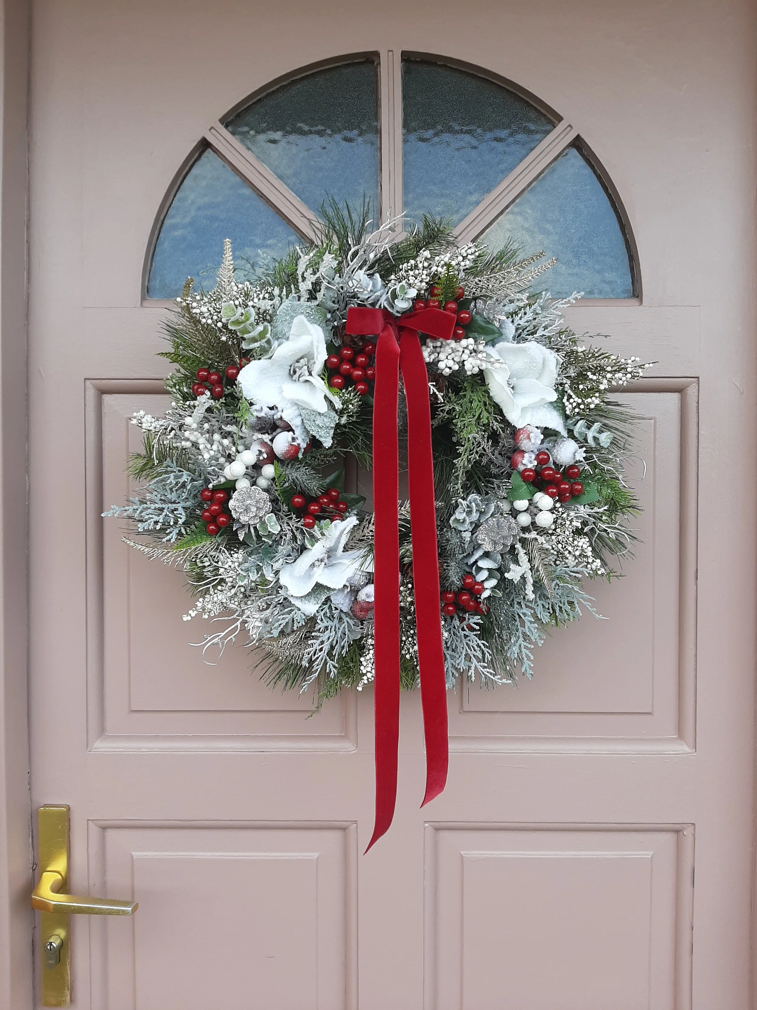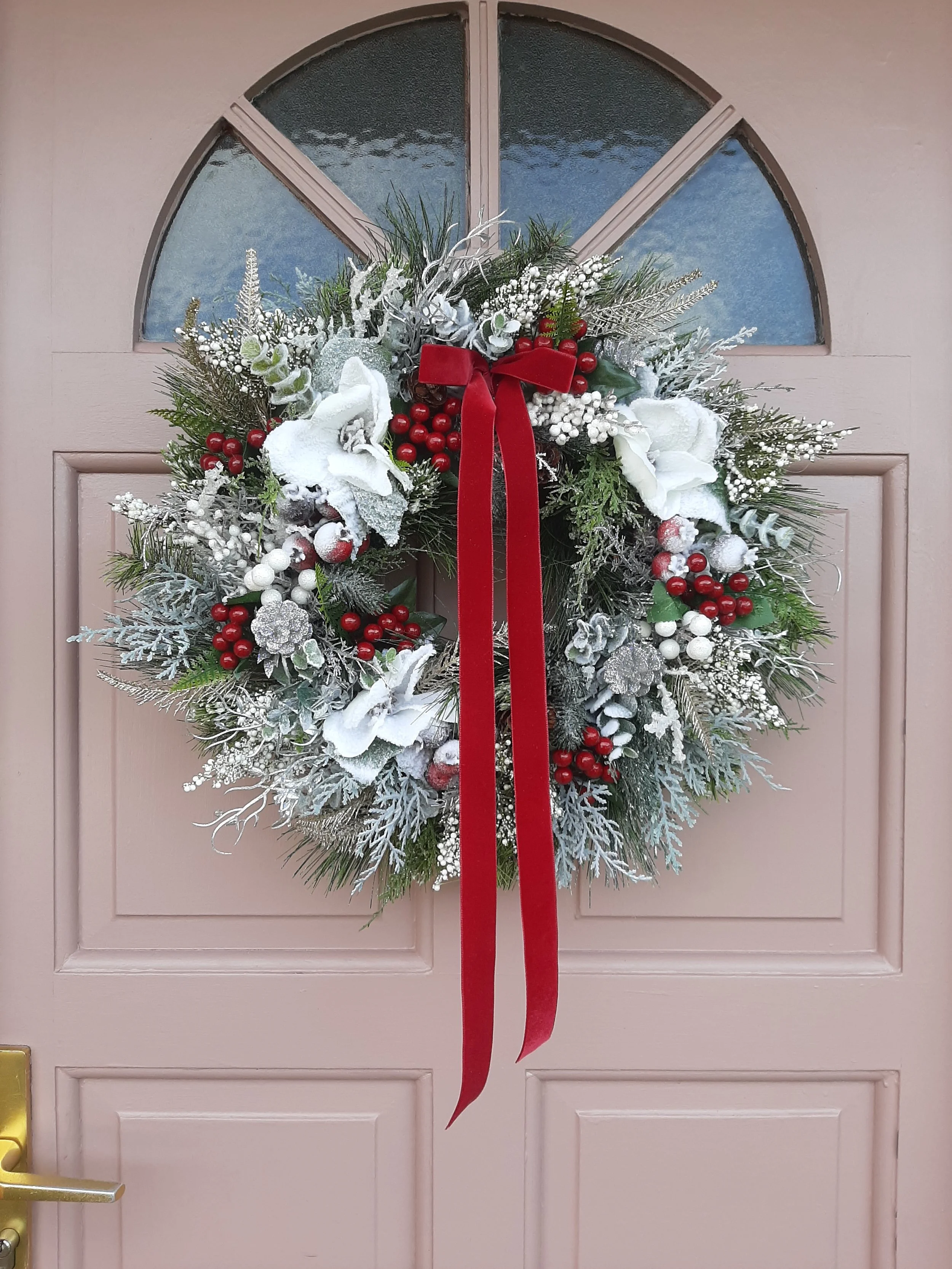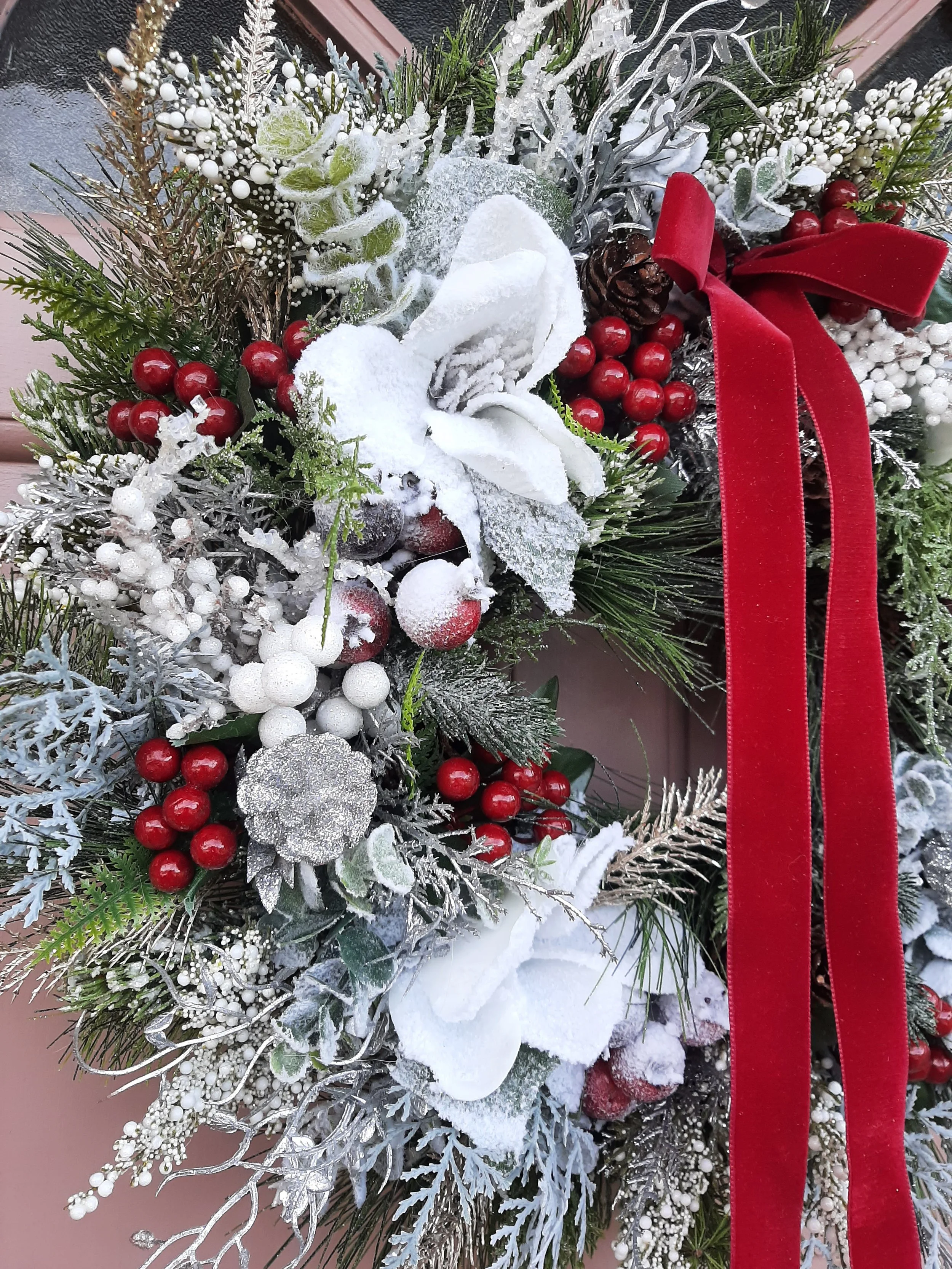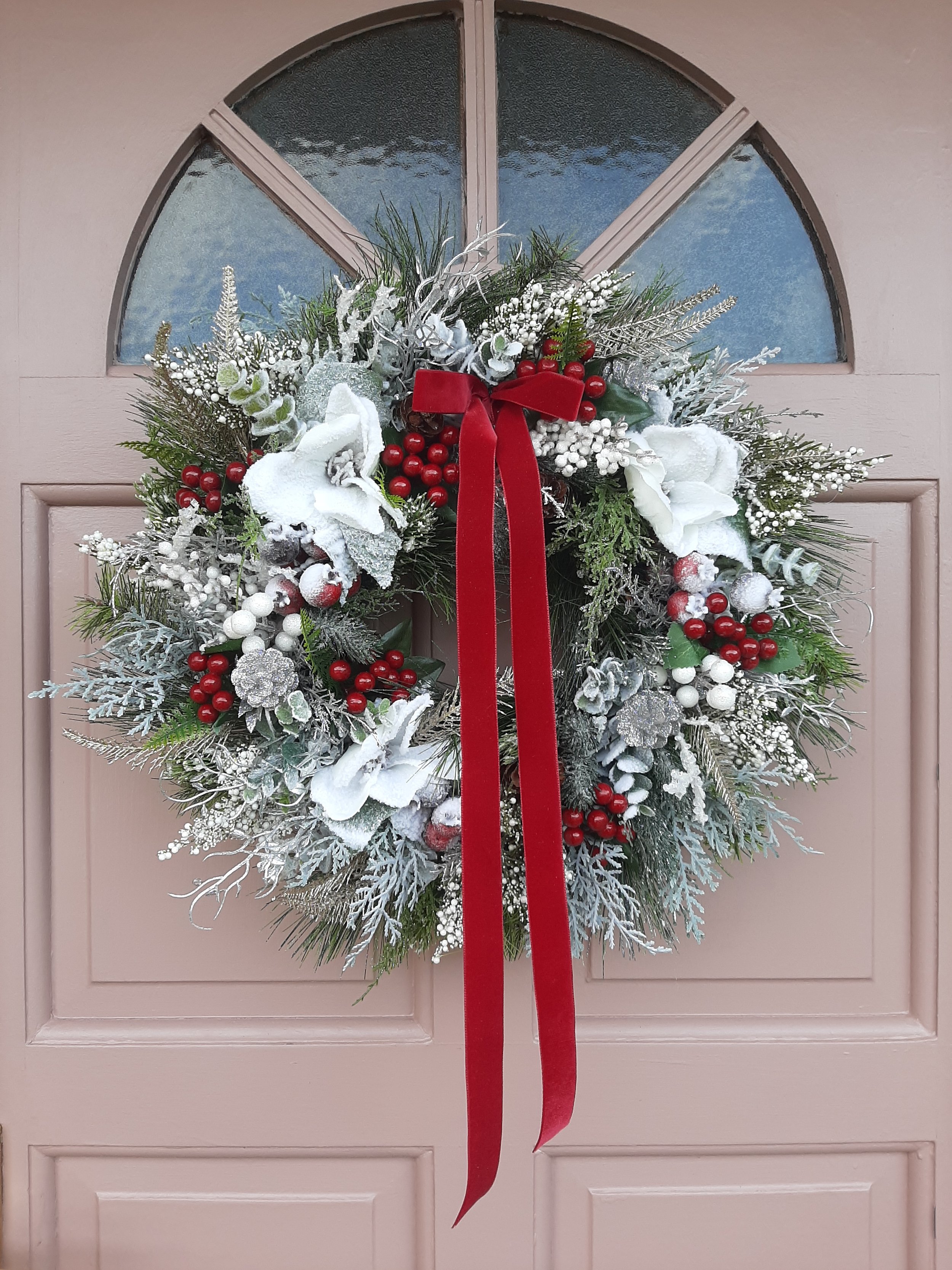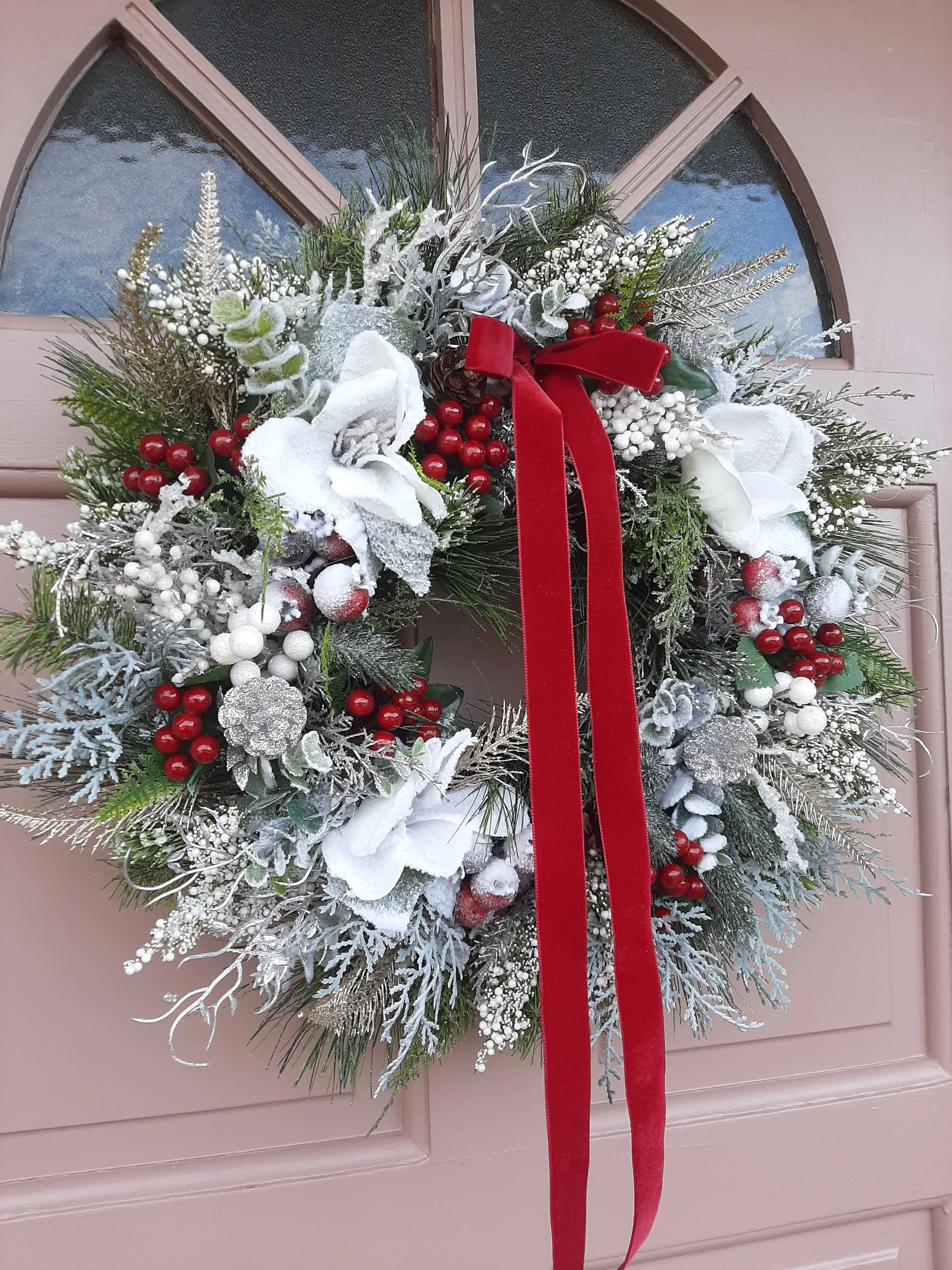 Snowy magnolia, frosted berries and glittering foliage completed with aolver pinecones and a rich red velvet bow