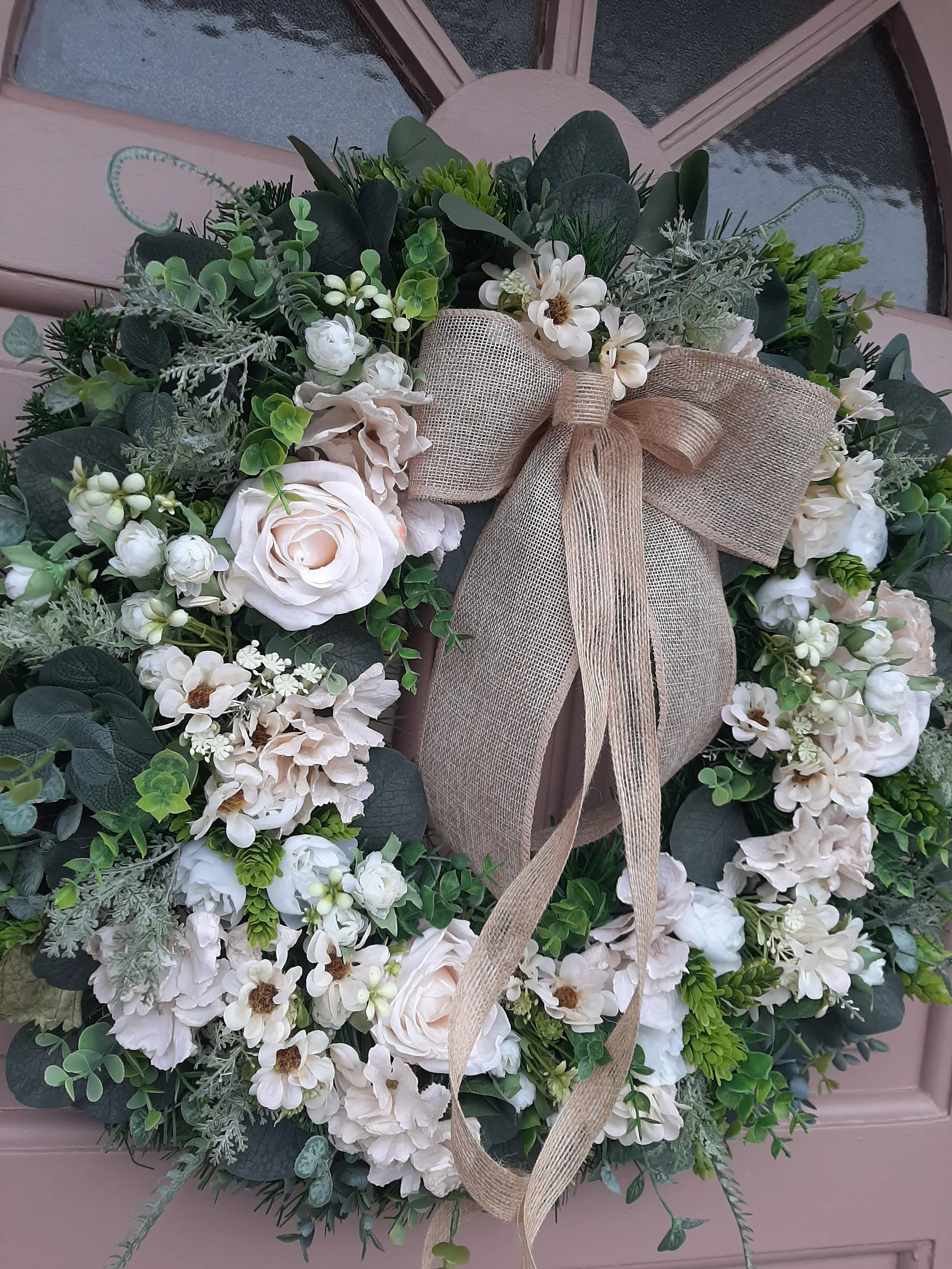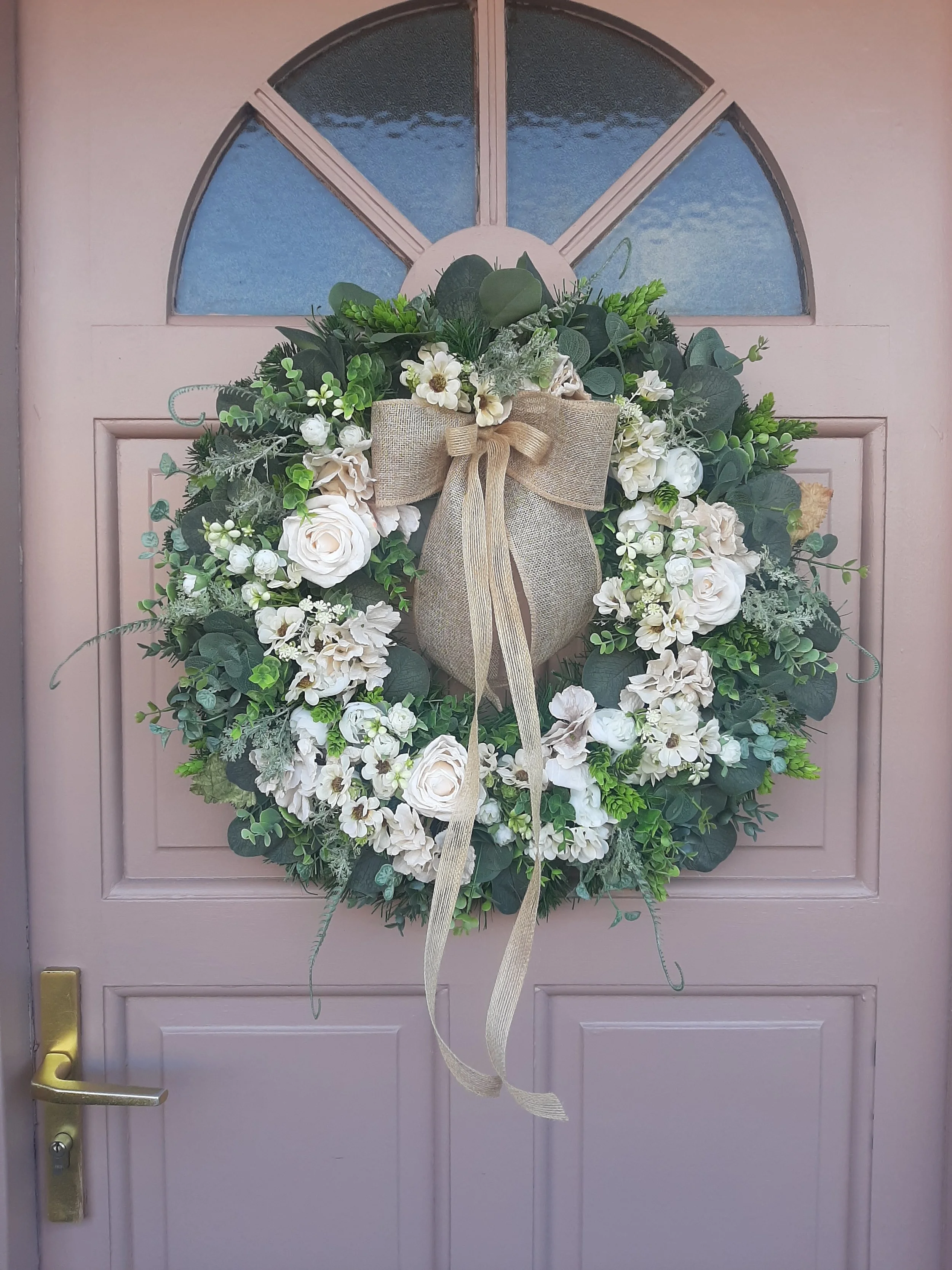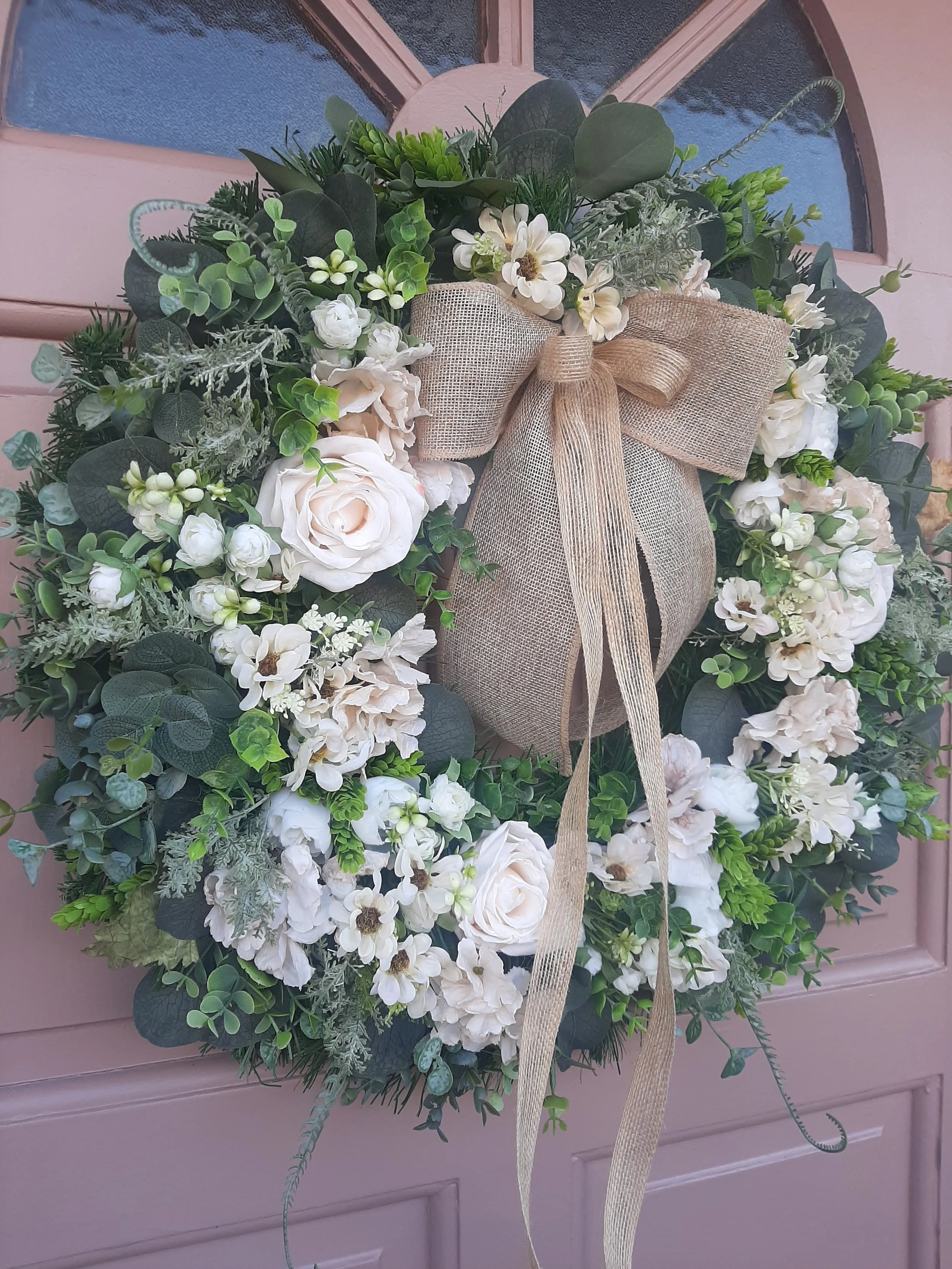 Created using roses, ranunculus, hydrangea, daisies and packed full of foliage completed with a double hessian bow.