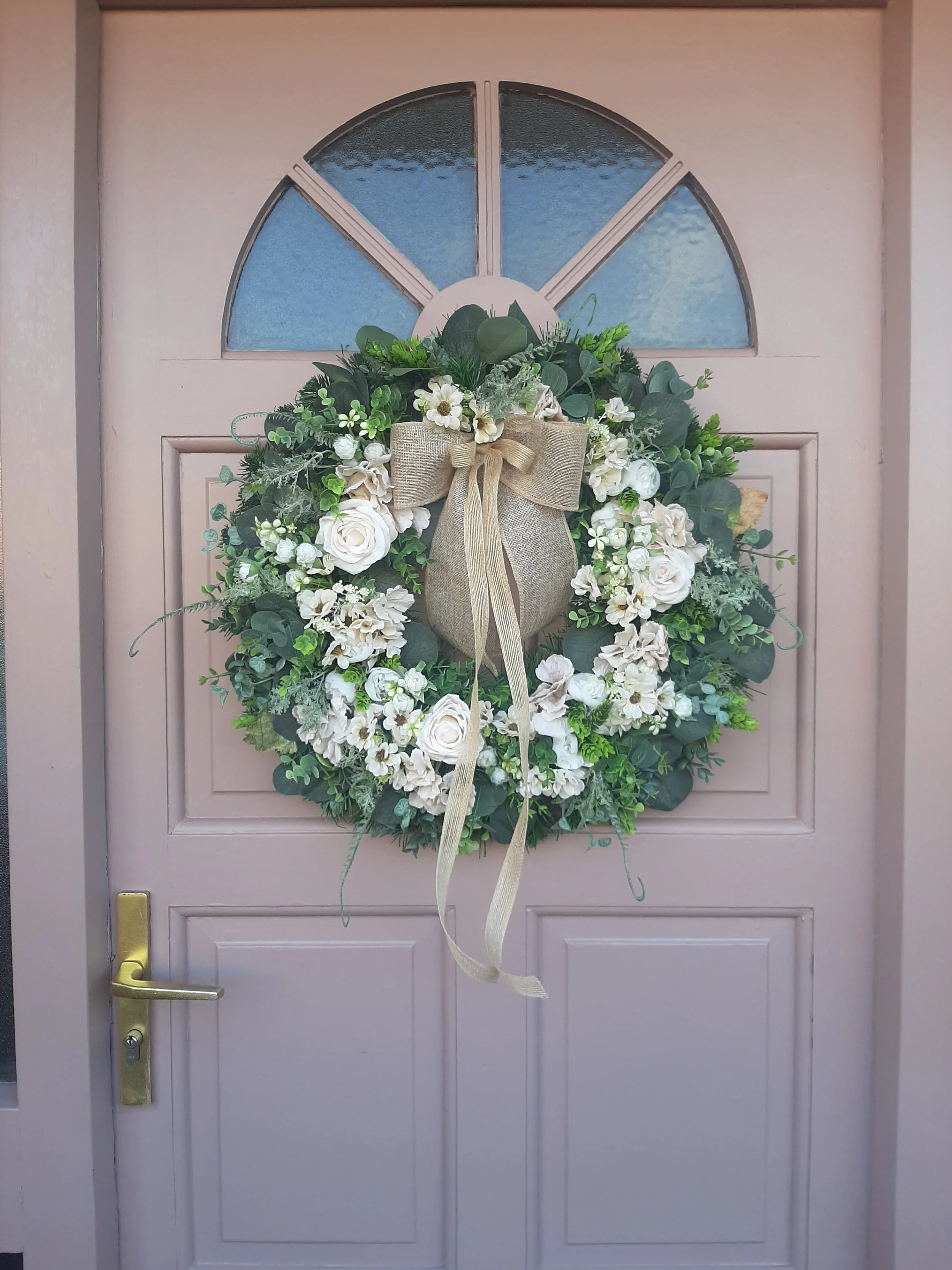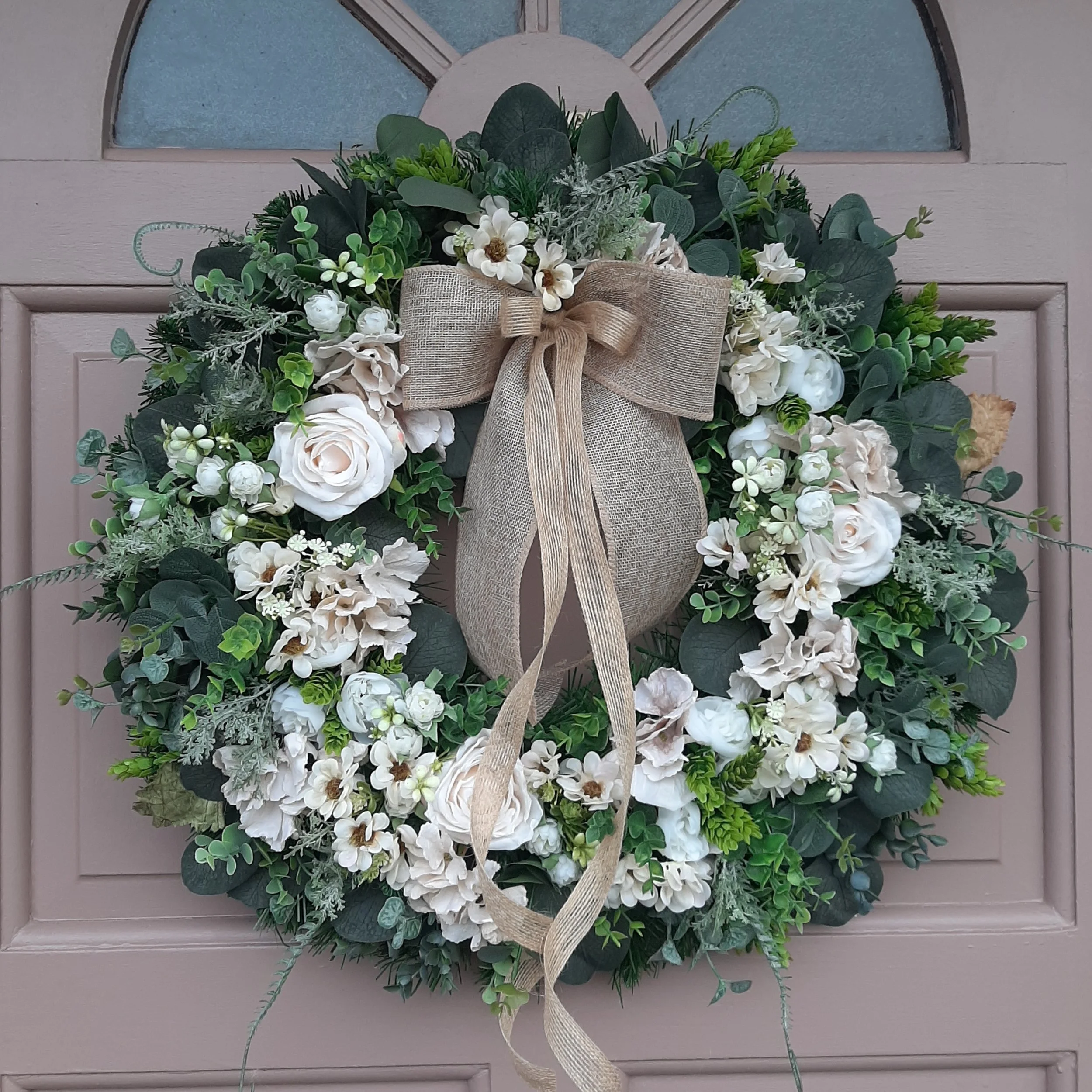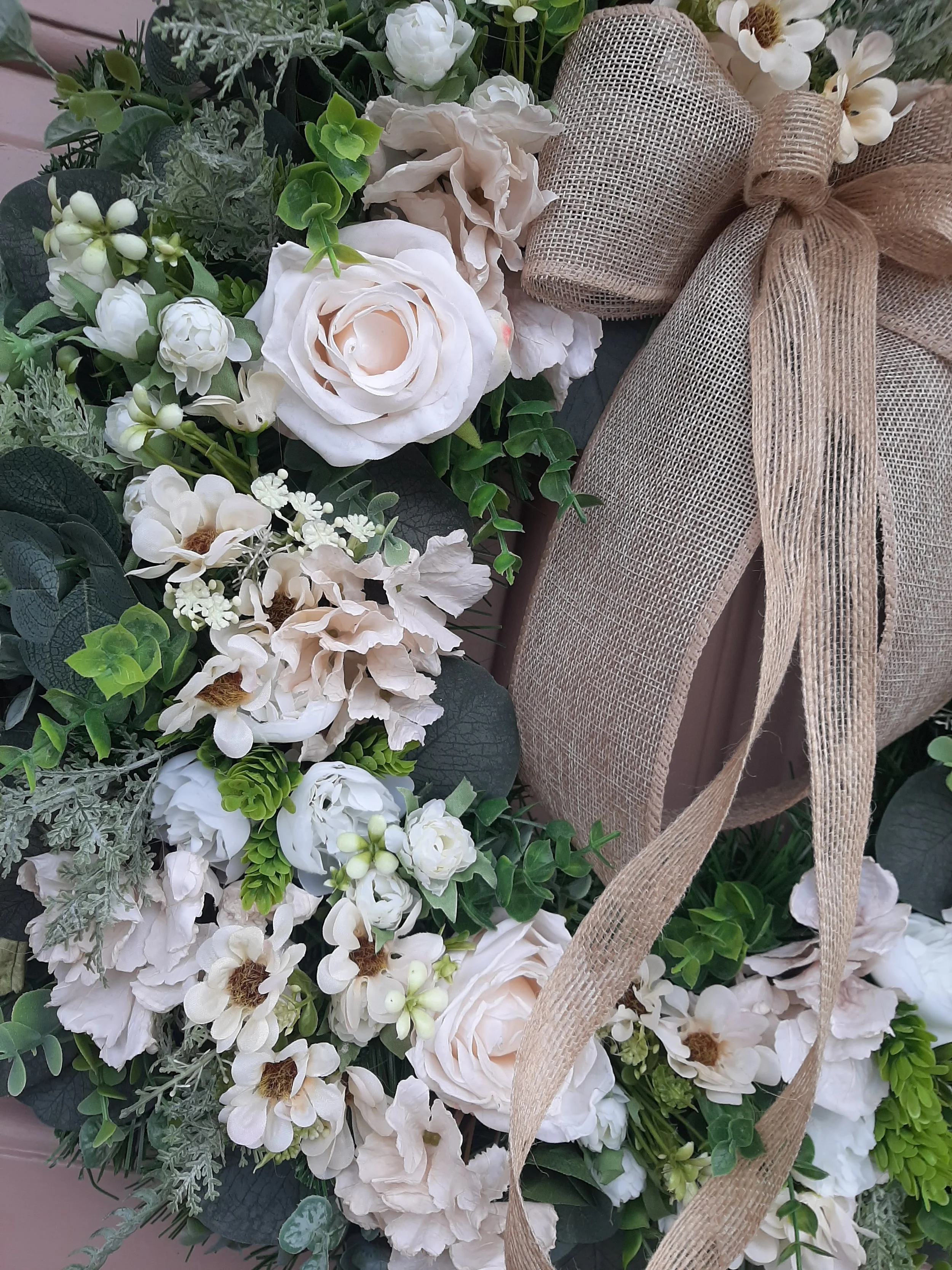Created using roses, ranunculus, hydrangea, daisies and packed full of foliage completed with a double hessian bow.