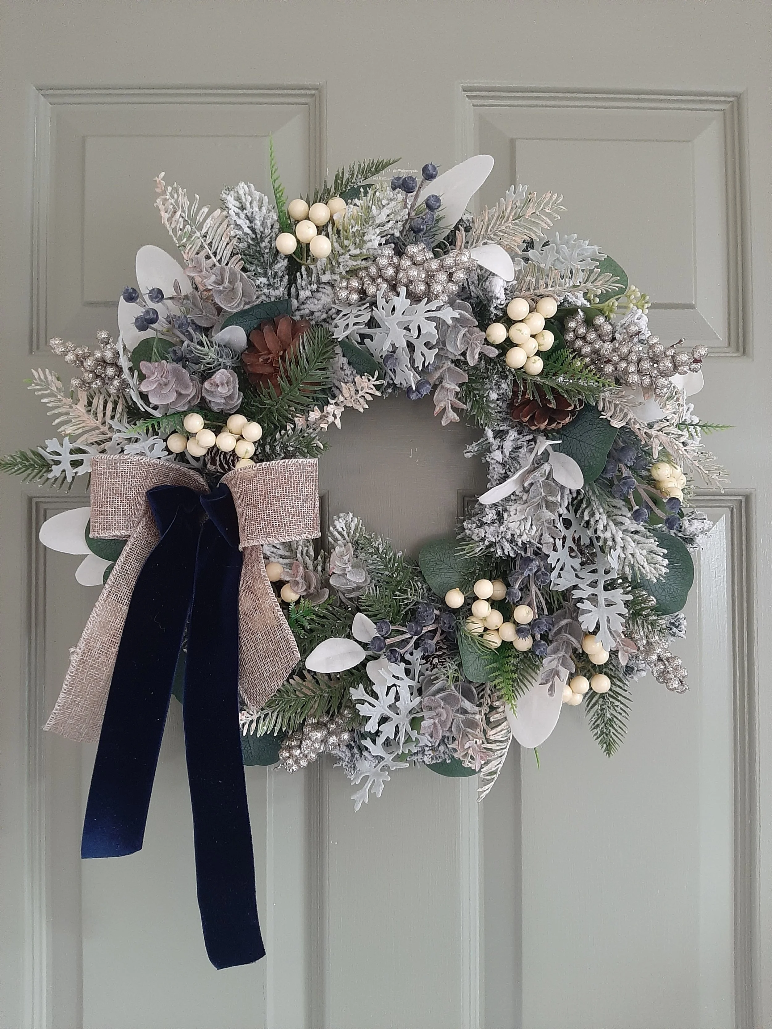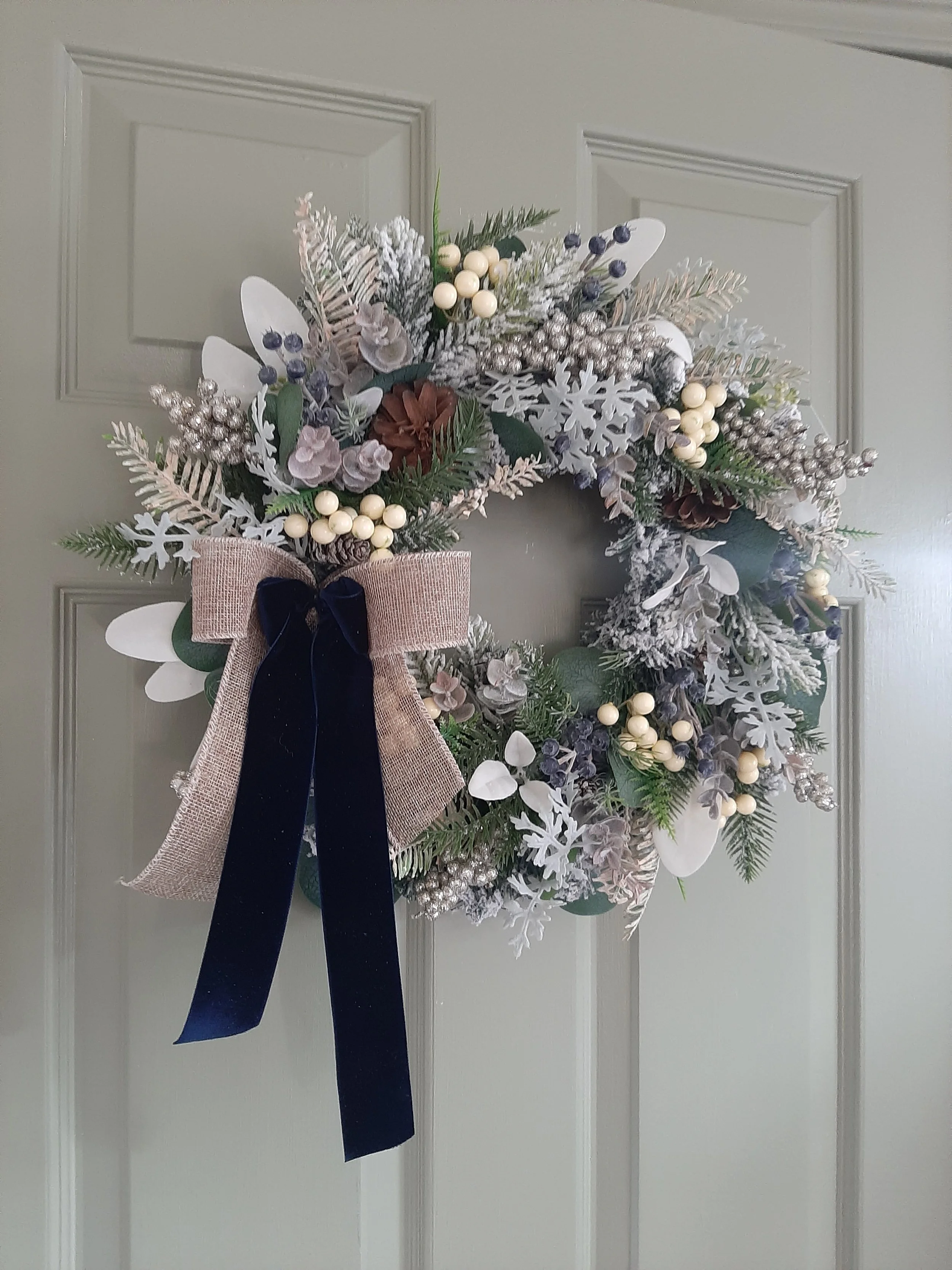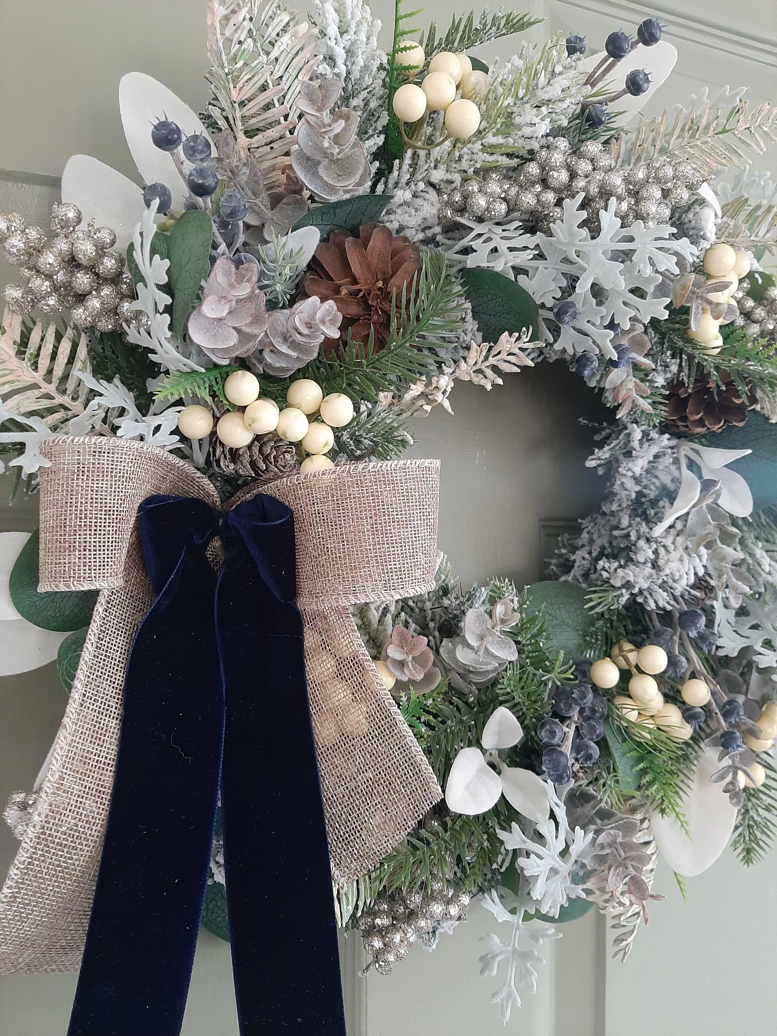 Created on a snowy base with navy and cream berries, pinecones and an abundance of foliage for added texture. Completed with a double bow of hessian and navy velvet ribbon